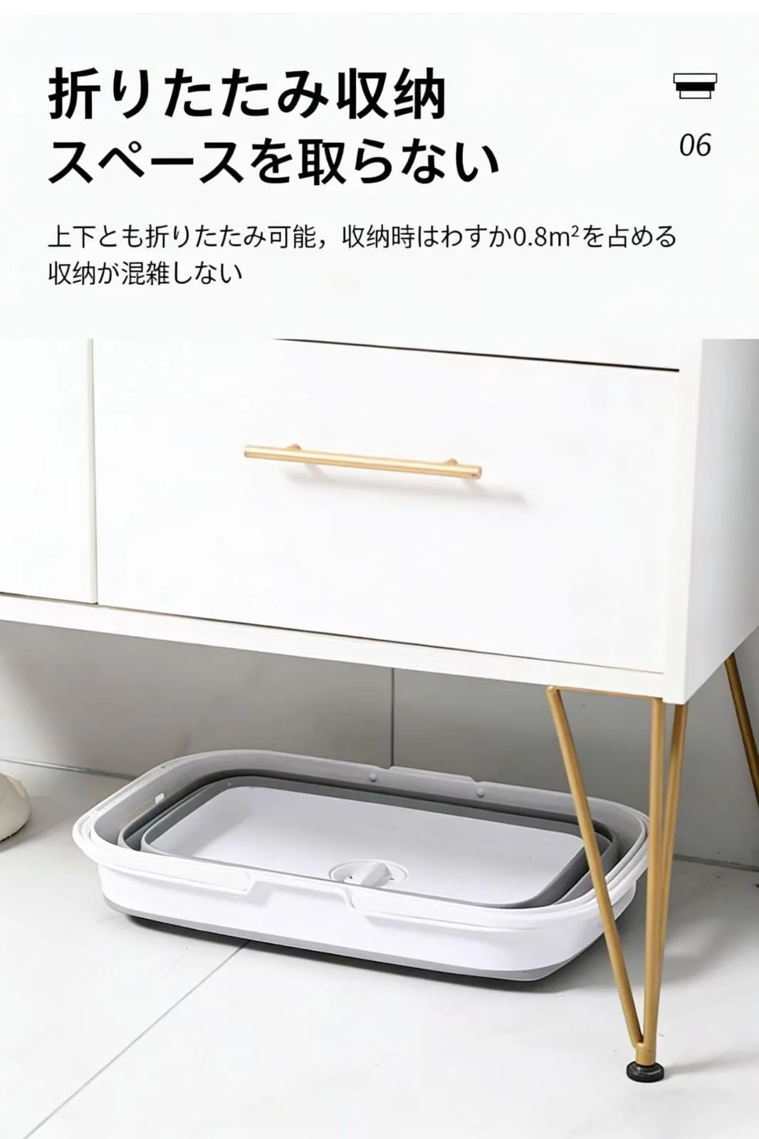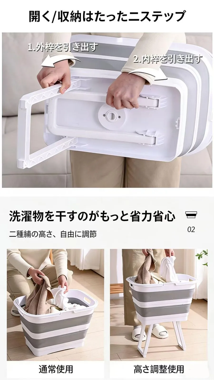 自立式スタンド付き: 折りたたみ可能な脚部により床から離して設置でき、腰をかがめずに洗濯物の出し入れができる便利な構造
