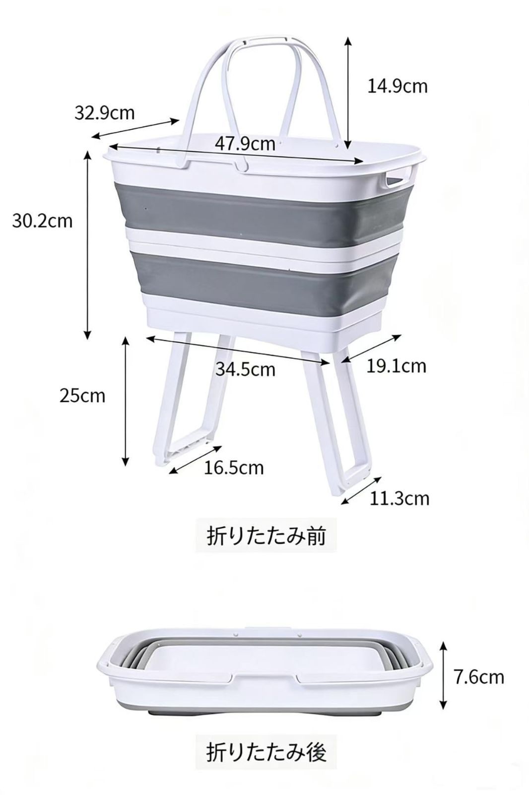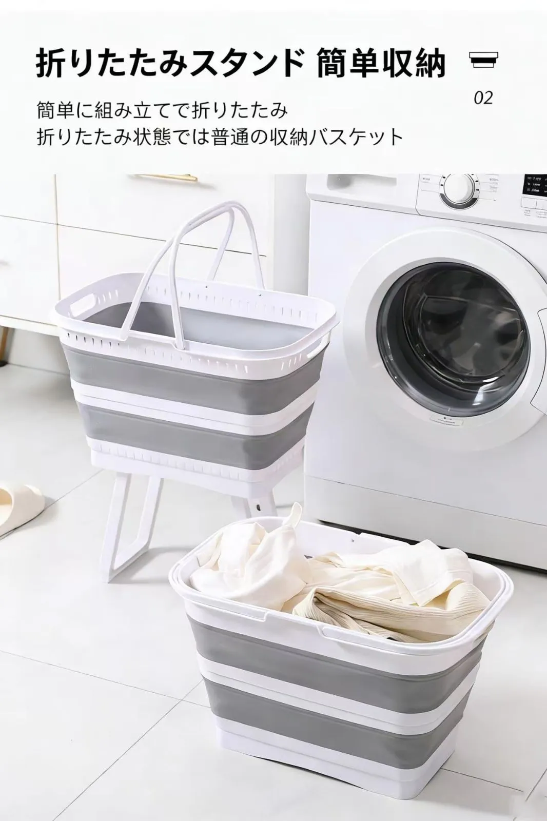 折りたたみ式設計: コンパクトに折りたためる洗濯かごで、使用しない時は省スペース収納が可能。サイズは48×33×50.8cmで26Lの大容量