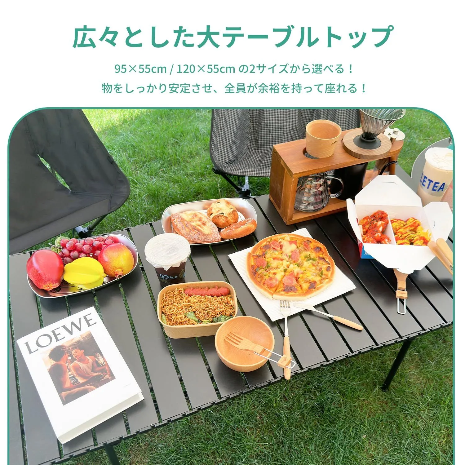 95cm(中型)と120cm(大型)の2サイズをご用意。大人数でもゆったり使える大きい キャンプ テーブルで、快適なアウトドアライフをサポートします!