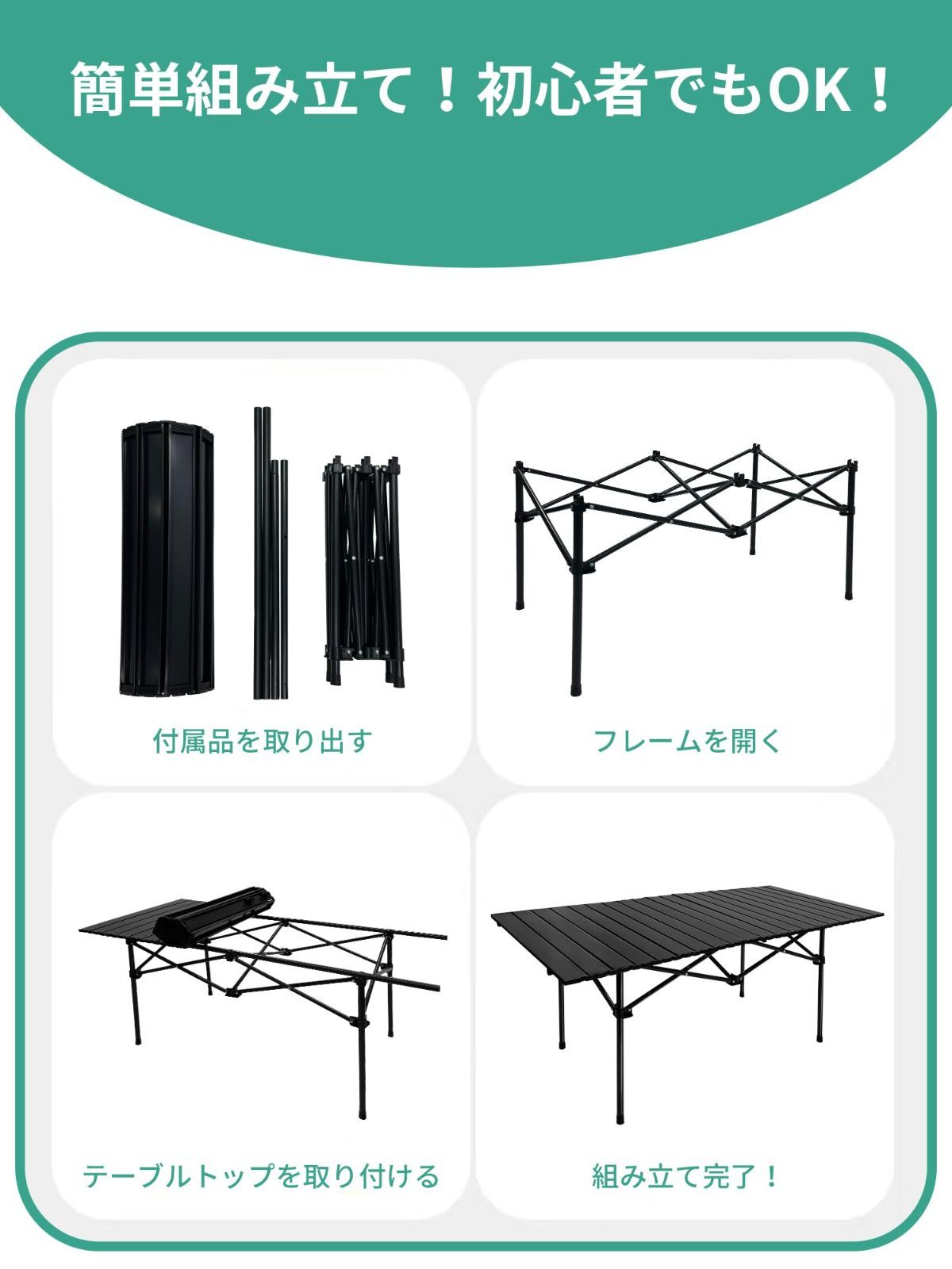 【3ステップ簡単設営|誰でも扱いやすい折りたたみ構造】フレームを開く → 側面ポールを取り付ける → 天板をセットするだけの組み立て簡単 テーブル。初めての方でも迷わずスムーズに設営できます。