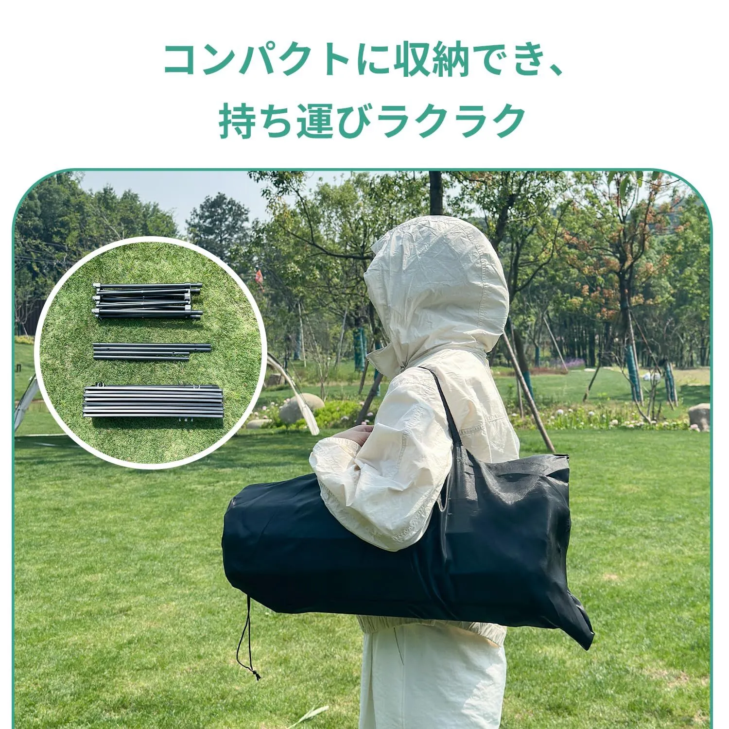 持ち運びもスムーズ!使用後は折りたたみ テーブルとしてコンパクトに収納袋へ。荷物が多い日でも安心の軽量仕様。