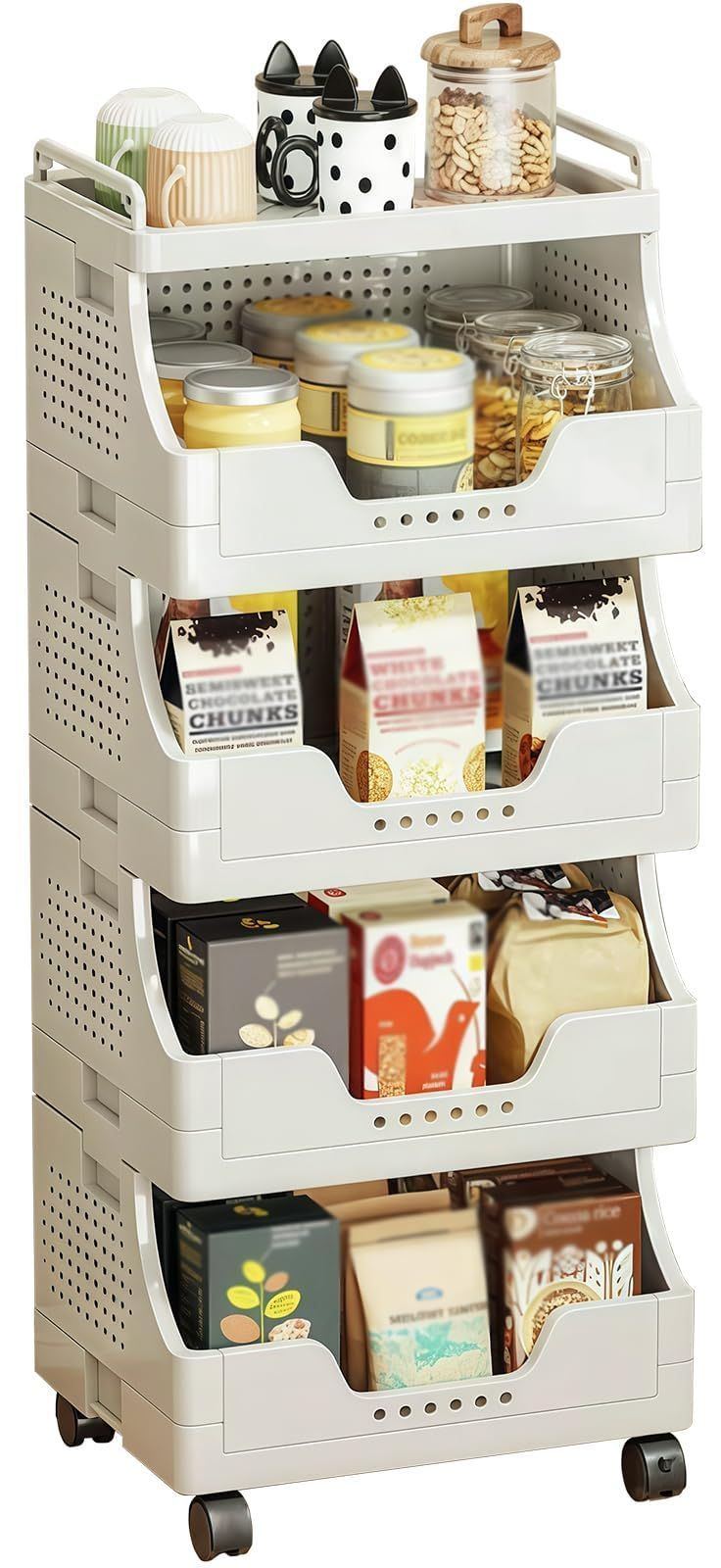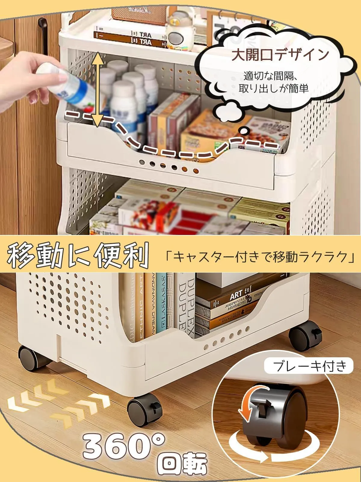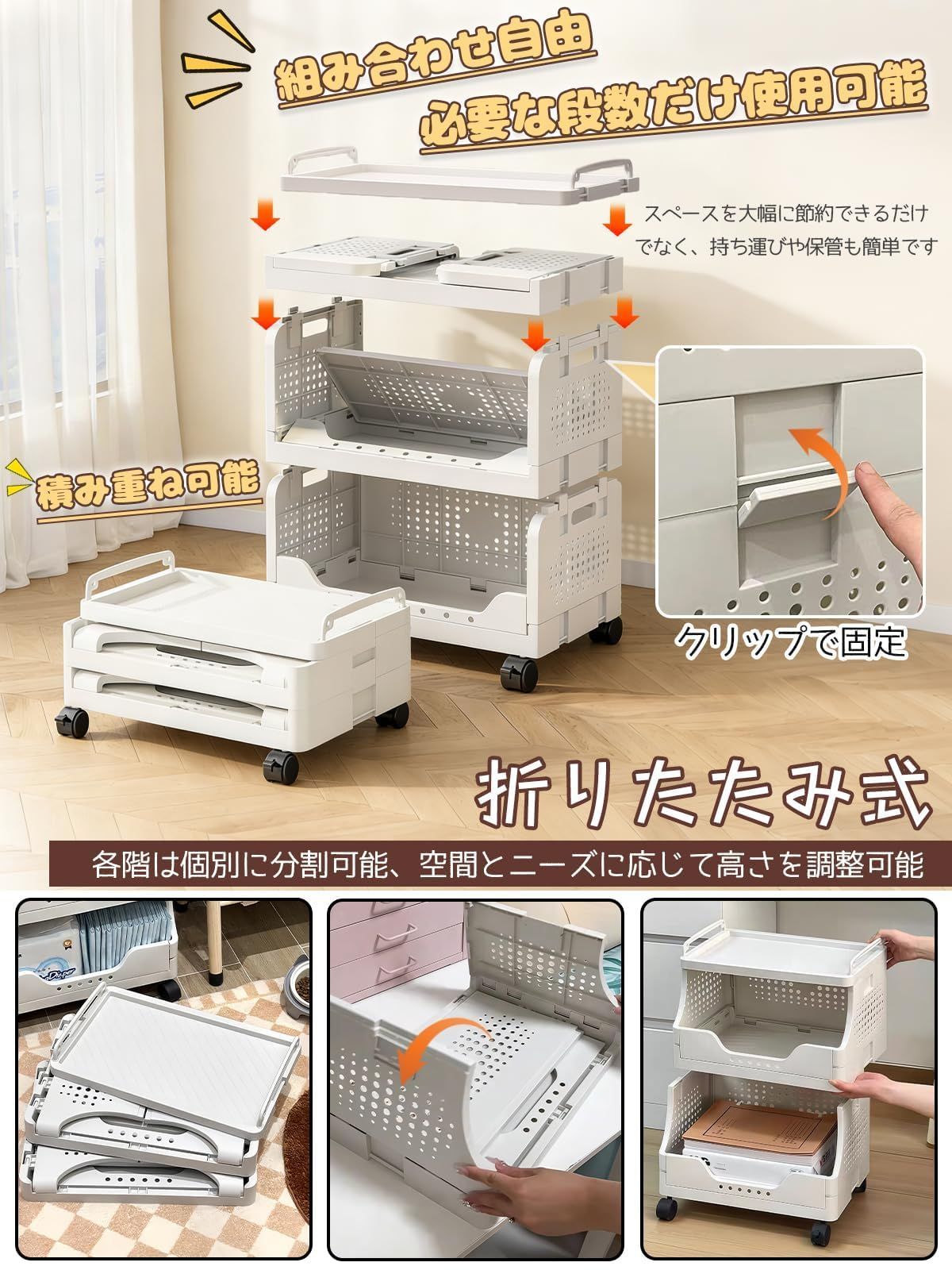 【折りたたみ式】キッチンワゴンは折りたたみ式のデザインを採用しており、使用しないときはコンパクトに収納できます。スペースを大幅に節約できるだけでなく、持ち運びや保管も簡単です。さらに、積み重ねも安定しているため、揺れたり転倒したりする心配が全くありません。