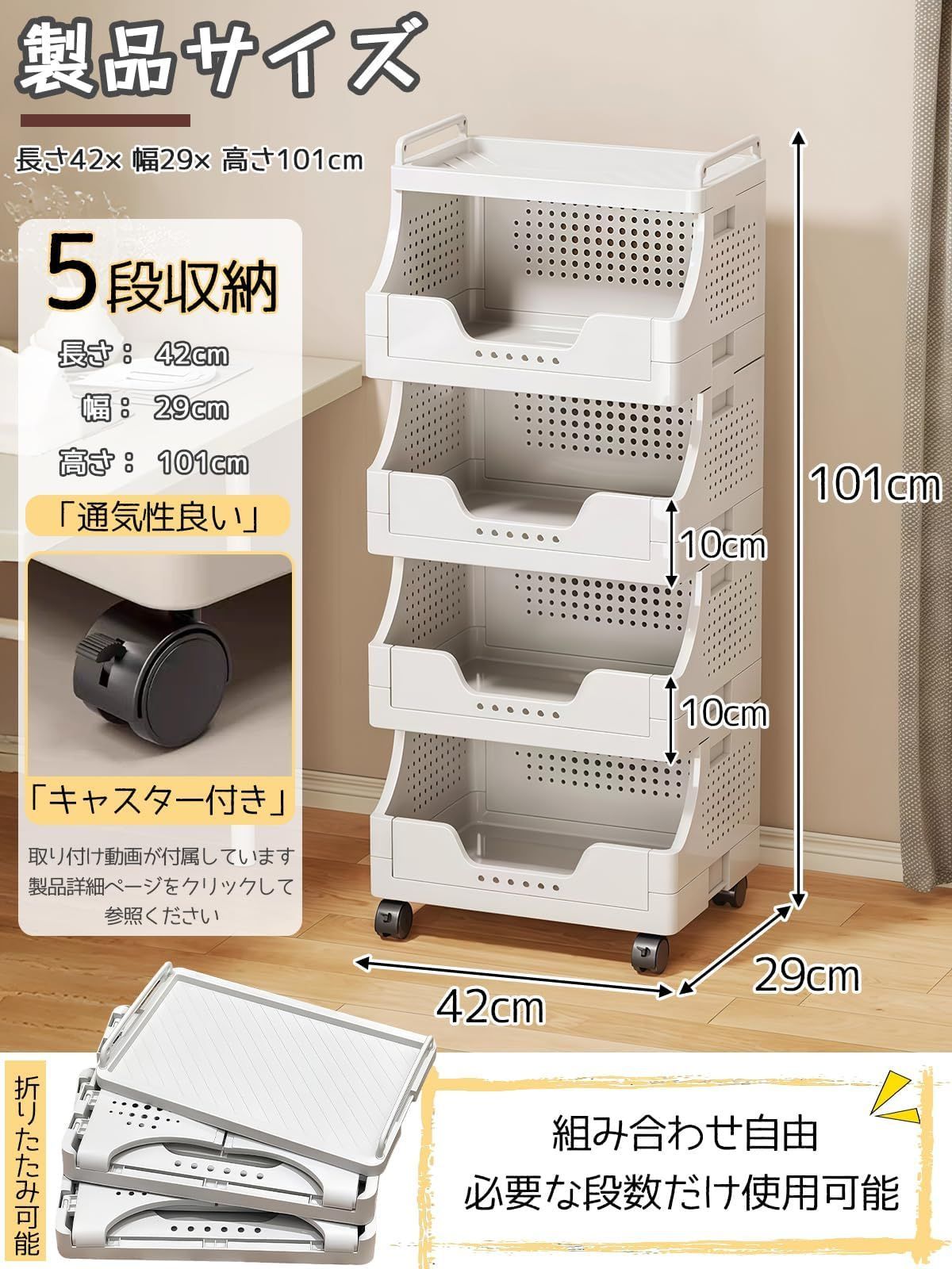 収納ワゴン キッチンワゴン キッチンラック 5段 幅42x奥行き29x高さ101.5cm 折りたたみ可能 収納カート キャスター付き 移動に便利 多機能 省スペース 隙間収納 組立簡単 バスルーム 洗面所 書斎 リビングルーム用(白い)