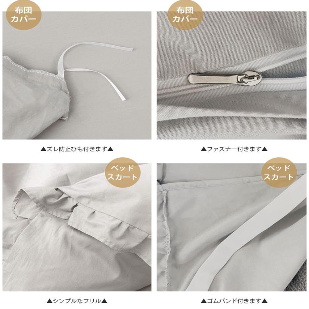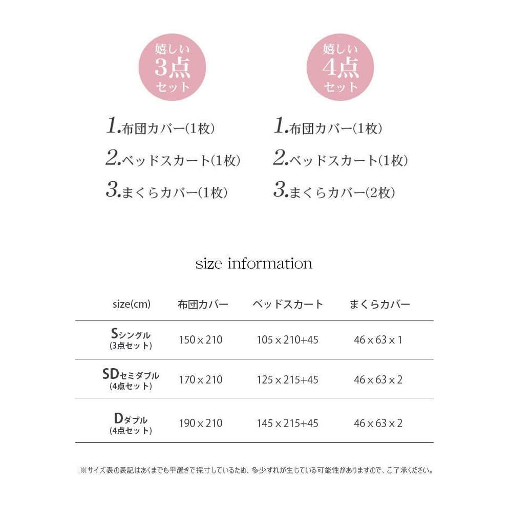 【セミダブル4点セット】 布団カバー:170×210cm ベッドスカート:125×215cm+45cm(マチ) 枕カバー:46×63cm×2枚