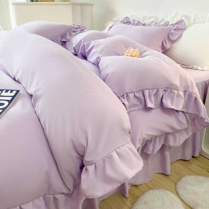 【かわいいデザイン 】 ピローケースと掛け布団カバーにはフリルをあしらい、シンプルな可愛さを表現しました。どんなお部屋にも合わせやすい無地柄で、高級感溢れる光沢もあり、自家用でも、ご両親、友人にプレゼントとしてもおすすめします。