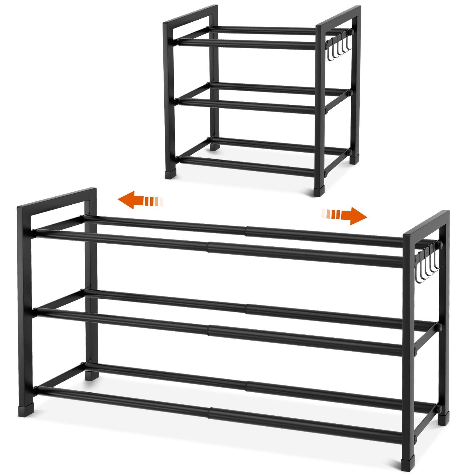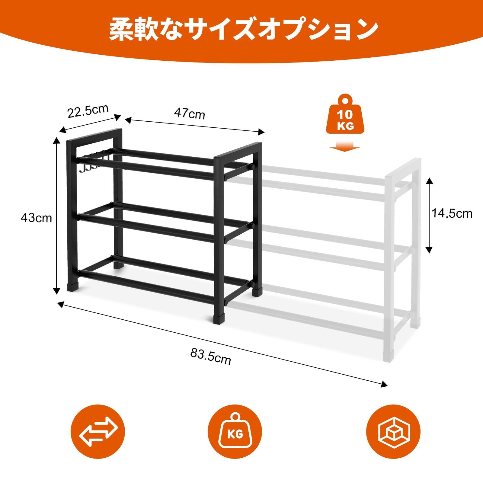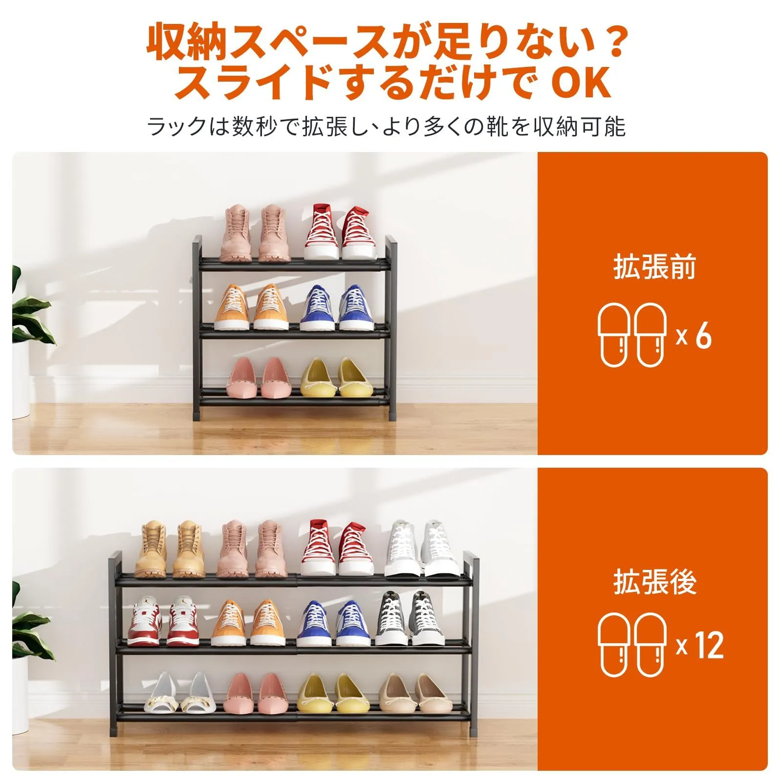 シューズラックスリム 3段 伸縮式シューズラック 47cm~83.5cm 幅調節可能 シューズラック 省スペース フリースタンディングシューズラック 金属製フレーム 靴棚オーガナイザー 玄関 クローゼット 寝室用 ブラック
