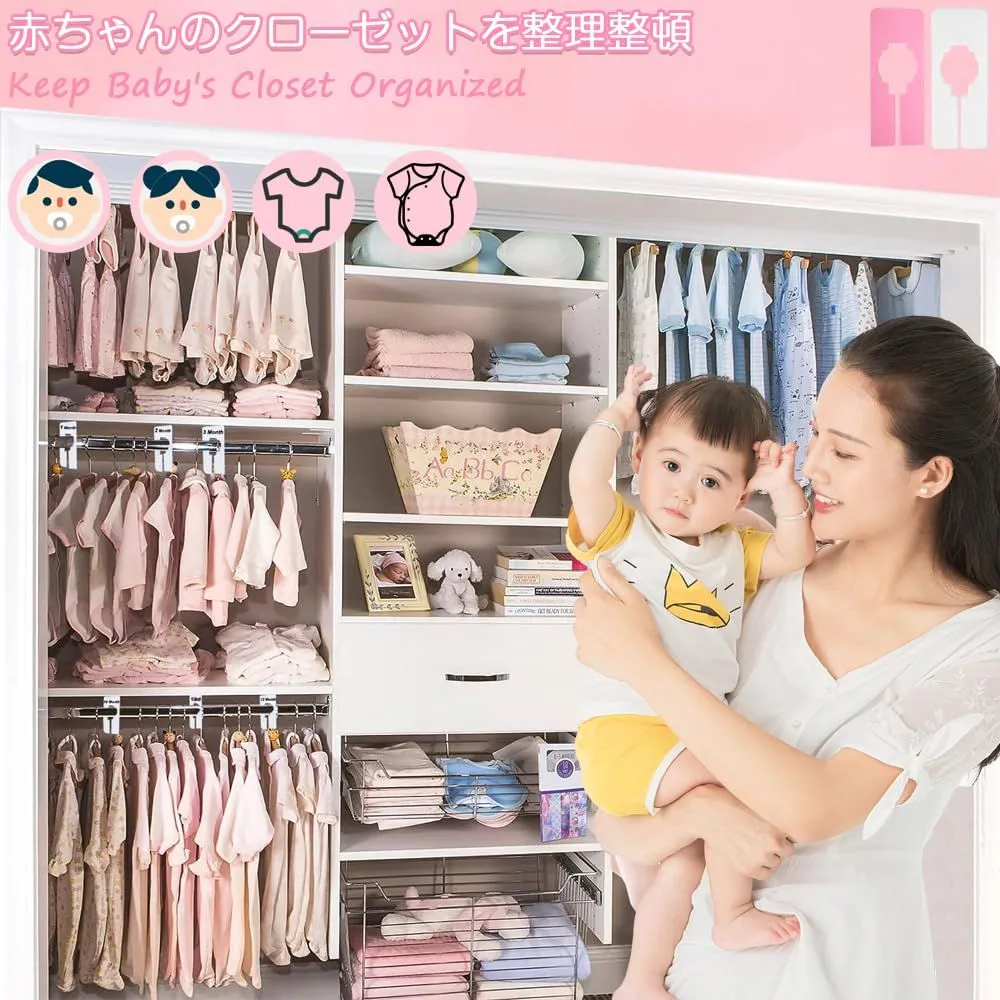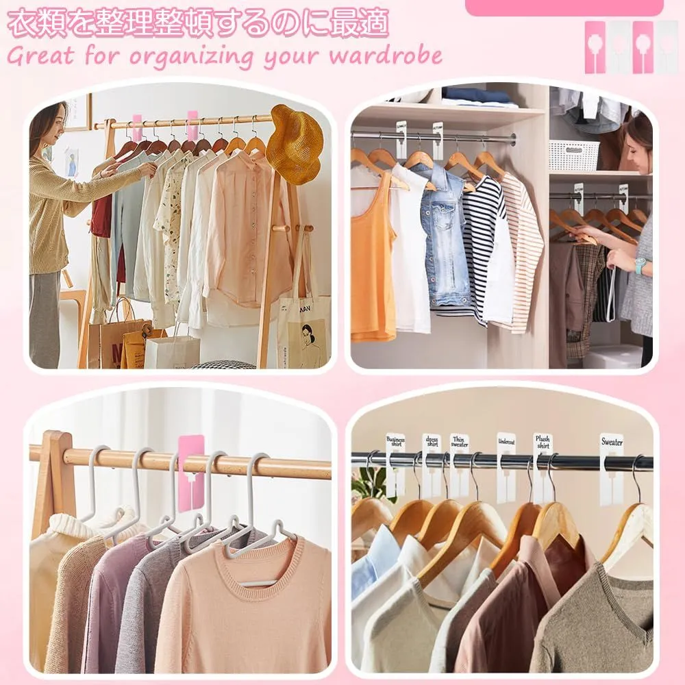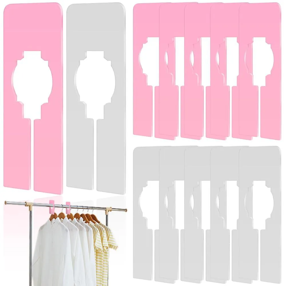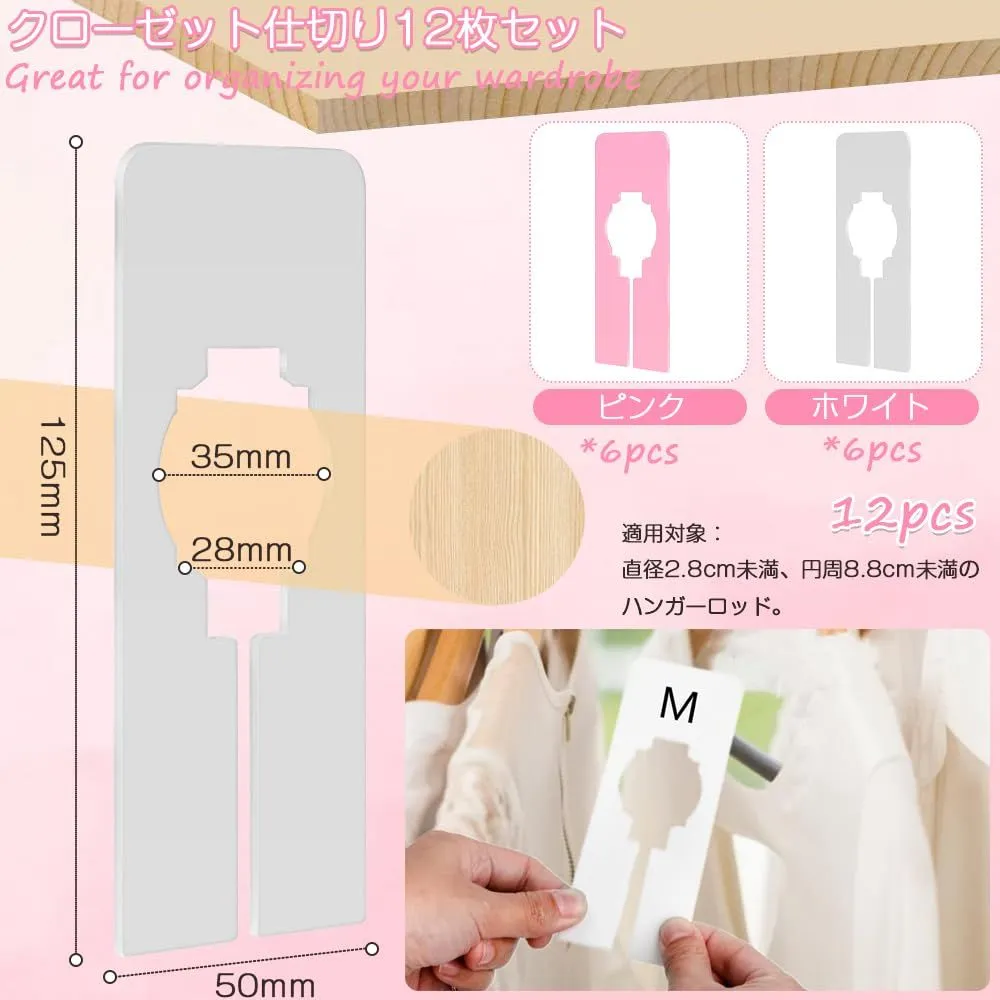 セット内容:洋服仕分け用ディバイダー12個セット;カラー:ピンク+ホワイト 2色各6個合計12個セット;サイズ情報:約12.5x5cm;適用対象:直径2.8cm未満、円周8.8cm未満のハンガーロッド。注意: 購入する前に、ロッドと底の間のスペースを測定してください。使用に影響がないことを確認してください。