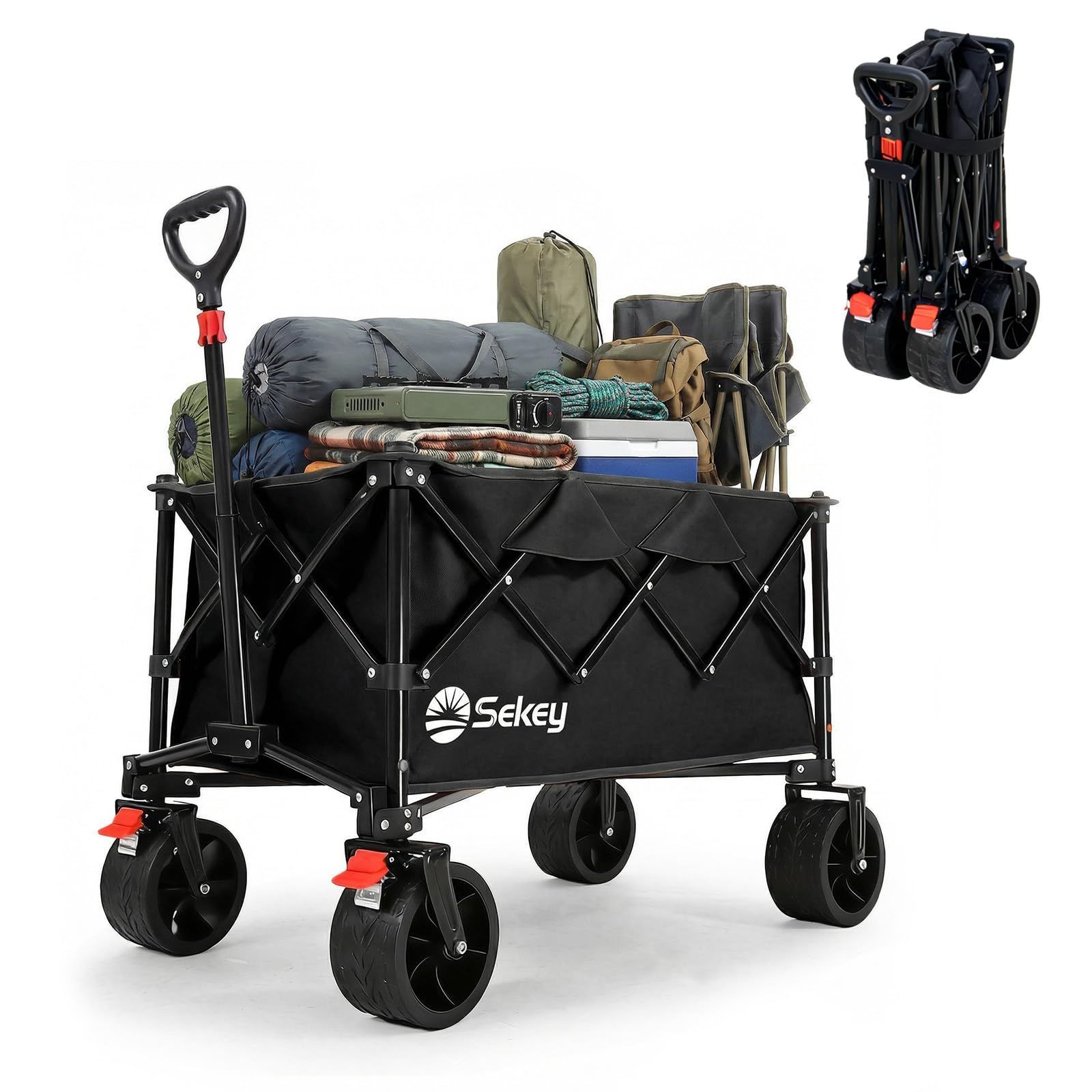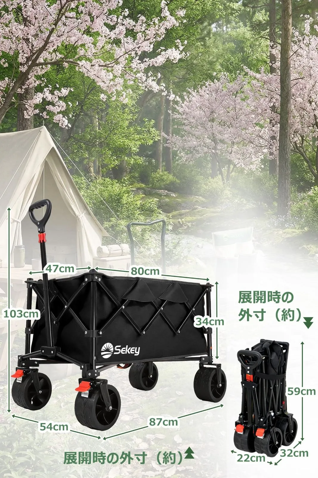【本体わずか約7.3kg】 タイヤ取り外し可能 アウトドアワゴン 断面幅約8.5cmのワイドタイヤ 高耐荷重150kg ブレーキ付き 軽量 自立収納 静音 キャンプ・レジャー・釣り・運動会 キャンプカート 黒