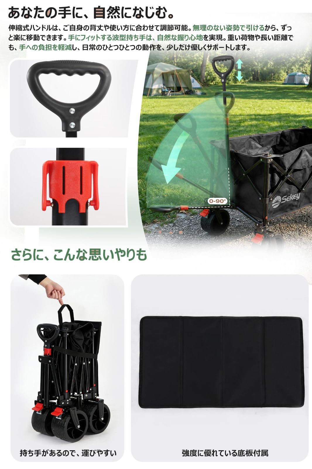【長時間使用でも疲れにくいハンドル】伸縮式ハンドルは、ご自身の背丈や使い方に合わせて調節可能。無理のない姿勢で引けるから、ずっと楽に移動できるキャンピングカートです。手にフィットする波型持ち手は、自然な握り心地を実現。重い荷物や長い距離でも、手への負担を軽減し、日常のひとつひとつの動作を、少しだけ優しくサポートします