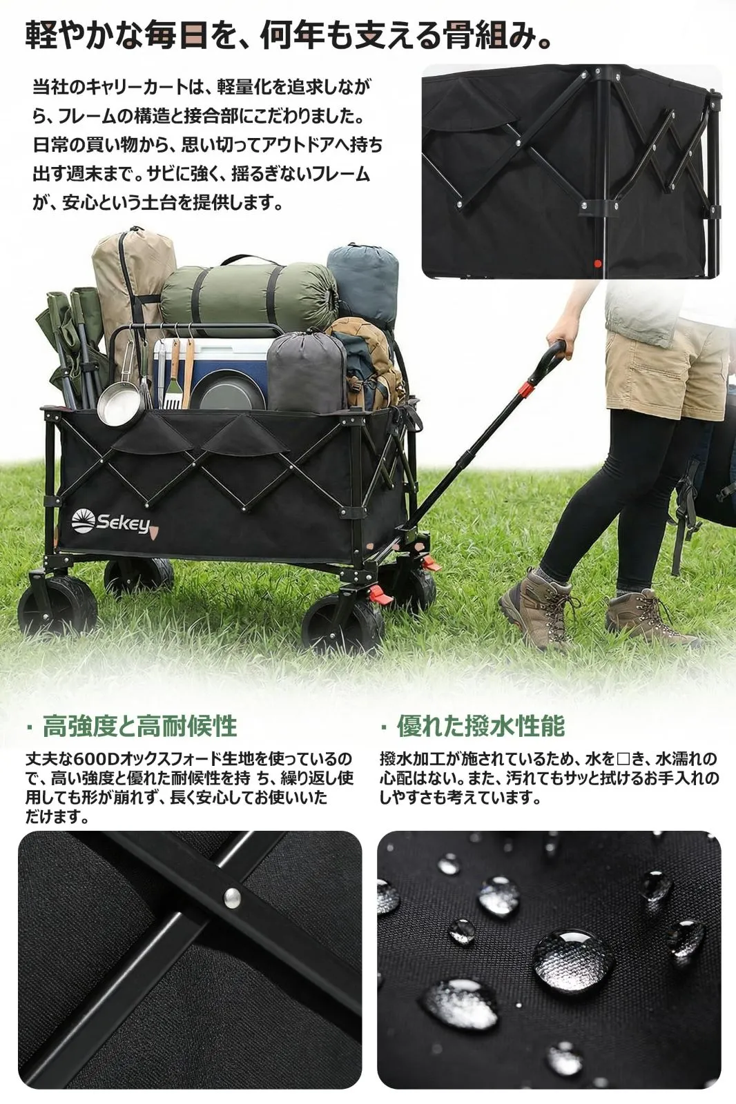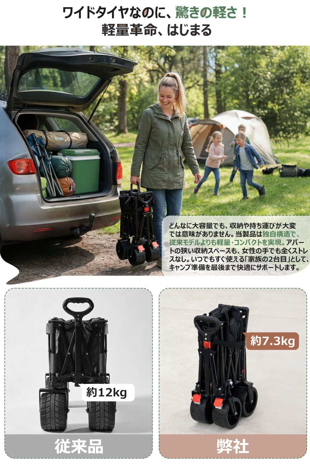 【大容量でワイドタイヤなのに、驚きの軽さ!】「大容量はいいけど、重くて持ち運びが大変そう」――そんな声に応え、当製品は独自構造で、従来モデルよりも軽量・コンパクトを実現。本体はわずか約7.3kgで、女性の片手でも楽に持ち上げられる重さです。アパートの階段や車への積み込みが苦にならず、「家族の2台目」として気軽に使えるアウトドア用キャリーカートです。重さへのストレスから解放されれば、「キャンプに行こう」と思う頻度も自然と増えます。軽さは、アクティブな週末を後押しします