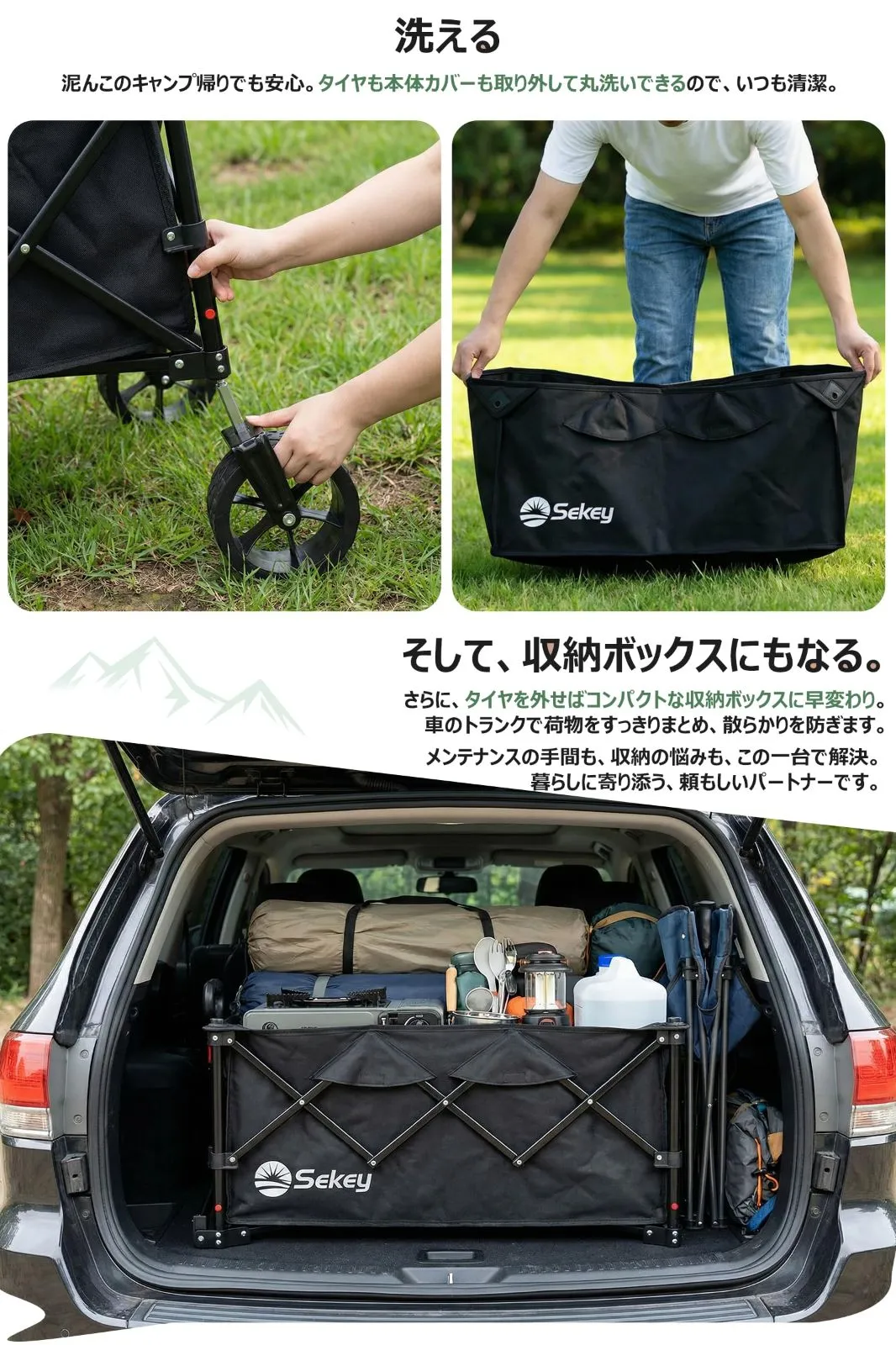 【洗える、そして、収納ボックスにもなる】雨のキャンプや泥んこ遊びの後、ワゴンに絡みついた砂や泥。放置するとカビや嫌なニオイの原因に。でも「本体が大きくて洗えない」と諦めていませんか。当製品はタイヤ・本体カバーともに完全取り外して丸洗いできるので、いつも清潔。さらに、タイヤを外せば折りたたみ式収納ボックスに早変わり。車のトランクで買い物袋が転がるのを防いだり、防災グッズのストックケースに。週末のキャンプ道具が、平日の暮らし道具に変わります