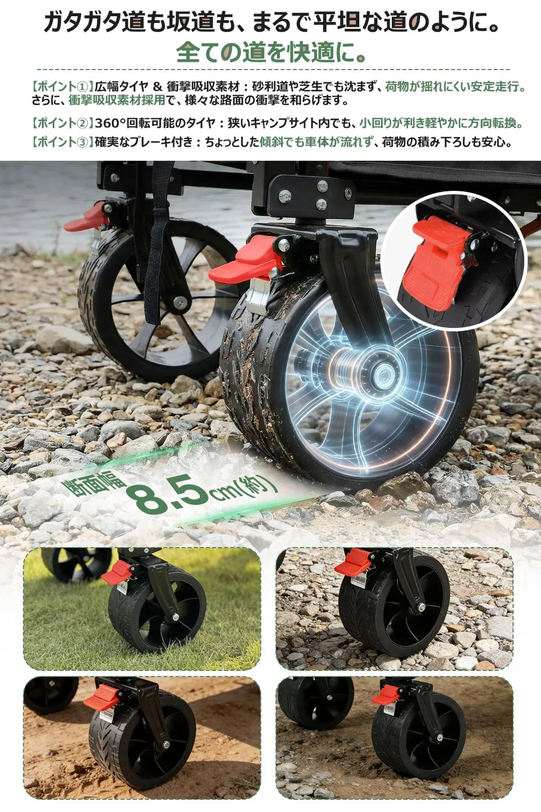 【ガタガタ道も坂道も、まるで平坦な道のように。全ての道を快適に】砂利道でタイヤが取られる、芝生で沈む、狭い通路で切り返しに手間取る――。せっかくのキャンプなのに、移動だけで気疲れしてしまいませんか。そんな声に応え、当製品には以下のような魅力が詰まっています。