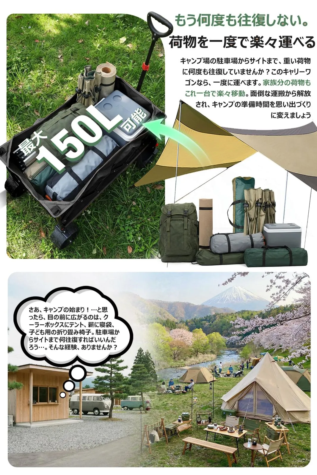 【もう何度も往復しない。荷物を一度で楽々運べる】キャンプ場の駐車場からサイトまで、重い荷物に何度も往復していませんか?このキャンプ カートなら、一度に運べます。家族分の荷物もこれ一台で楽々移動。面倒な運搬から解放され、キャンプの準備時間を思い出づくりに変えましょう