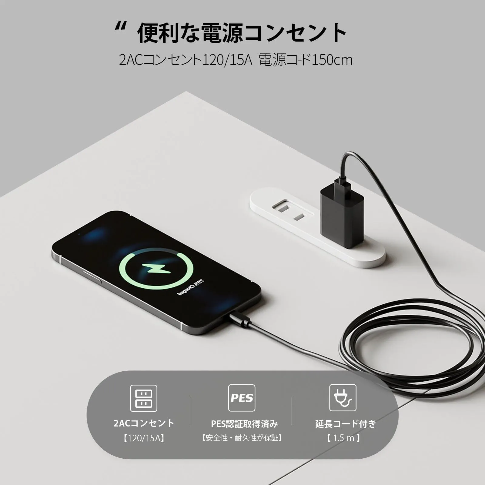 【簡単な組み立て】必要な工具が同梱されており。机には日本語の説明書がついています。シンプルな構造で、男女ともに組み立てられます。設置時間は平均40分程度です。天板にはPSE認証取得の埋め込みコンセント2口を標準装備。配線がすっきりし、充電も便利。さらに、表面は防水・防傷加工で、日常の使用にも安心です。