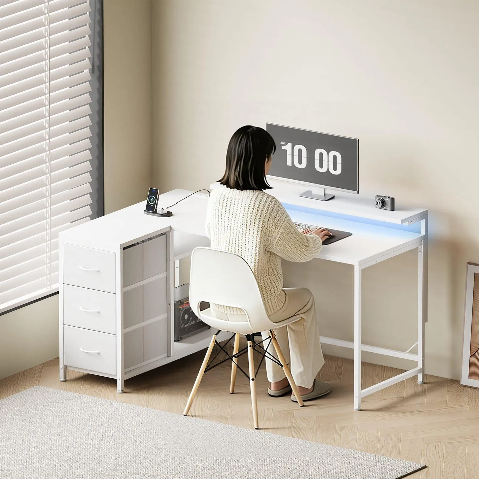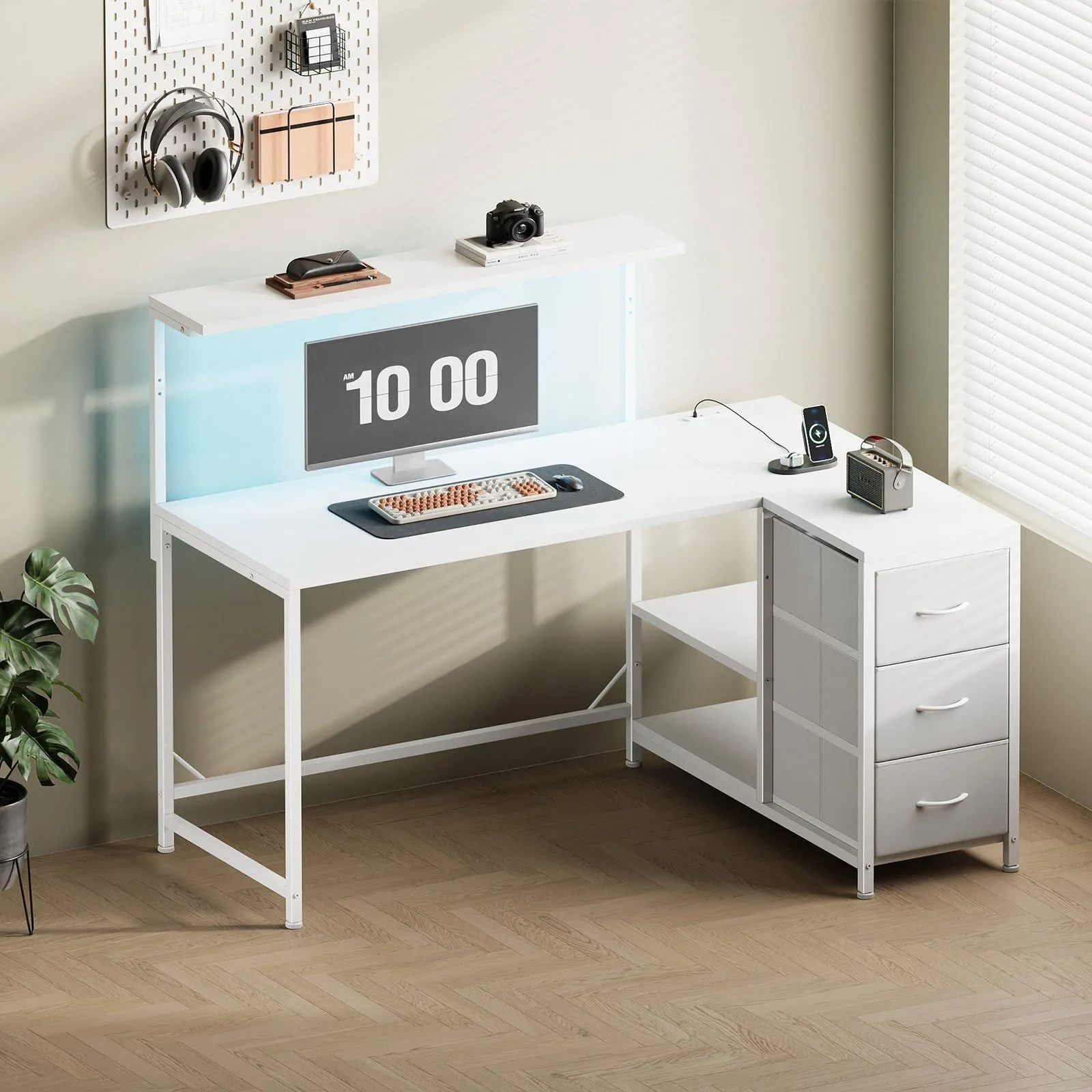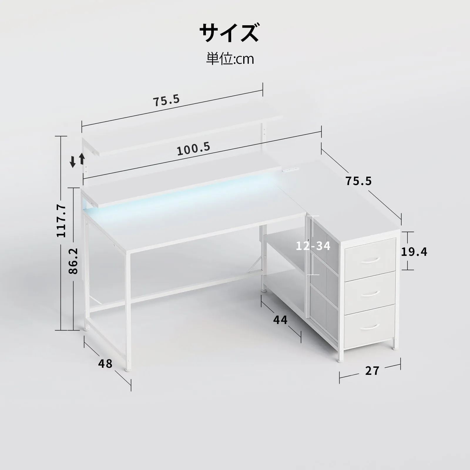 l字デスク 幅100.5cm パソコンデスク 机 pcデスク モニタ台の高さ調節可能 コーナーデスク 本棚付き 引き出しとコンセント付き 左右入れ替え対応 オフィスデスク 勉強机 学習机 ホームオフィス用 白い