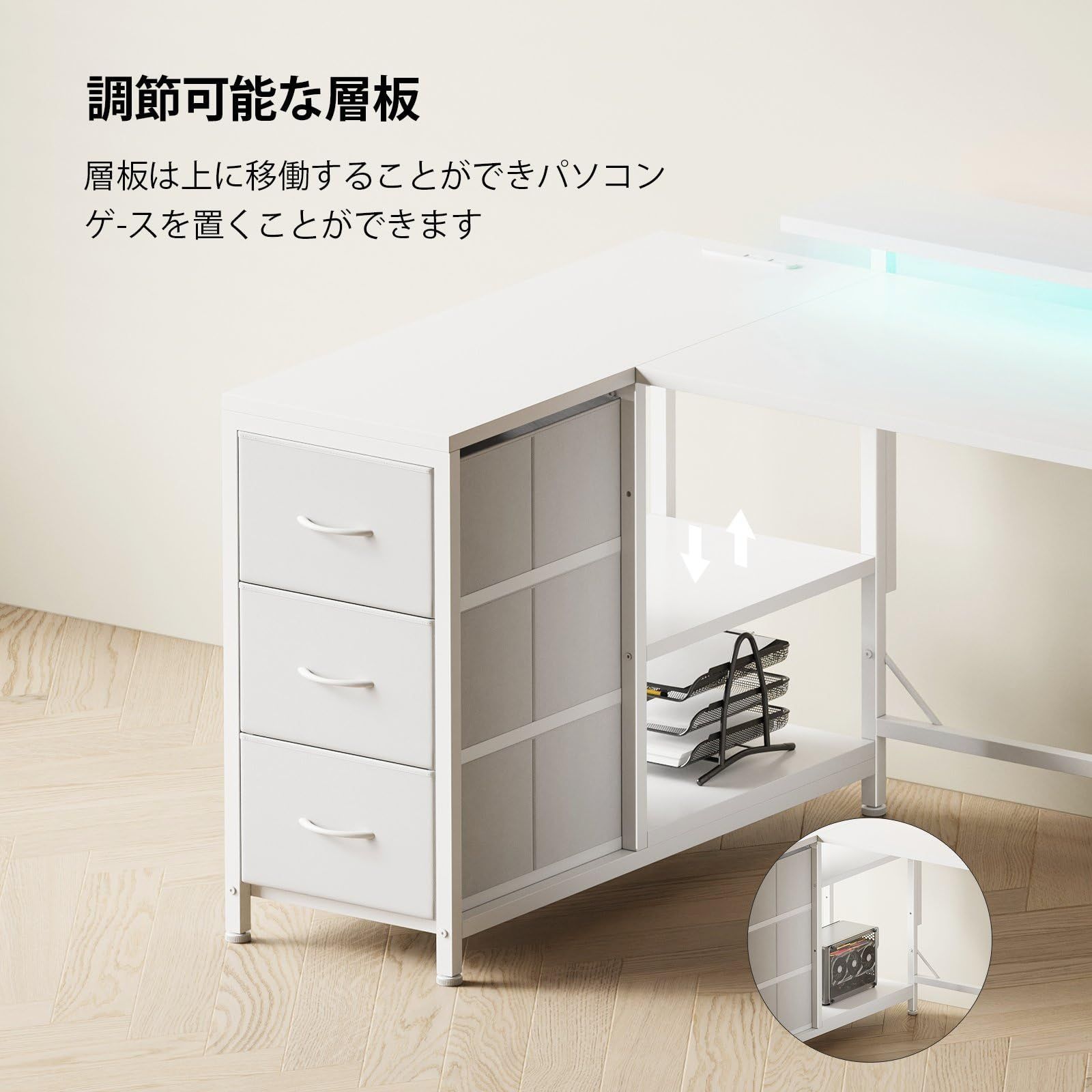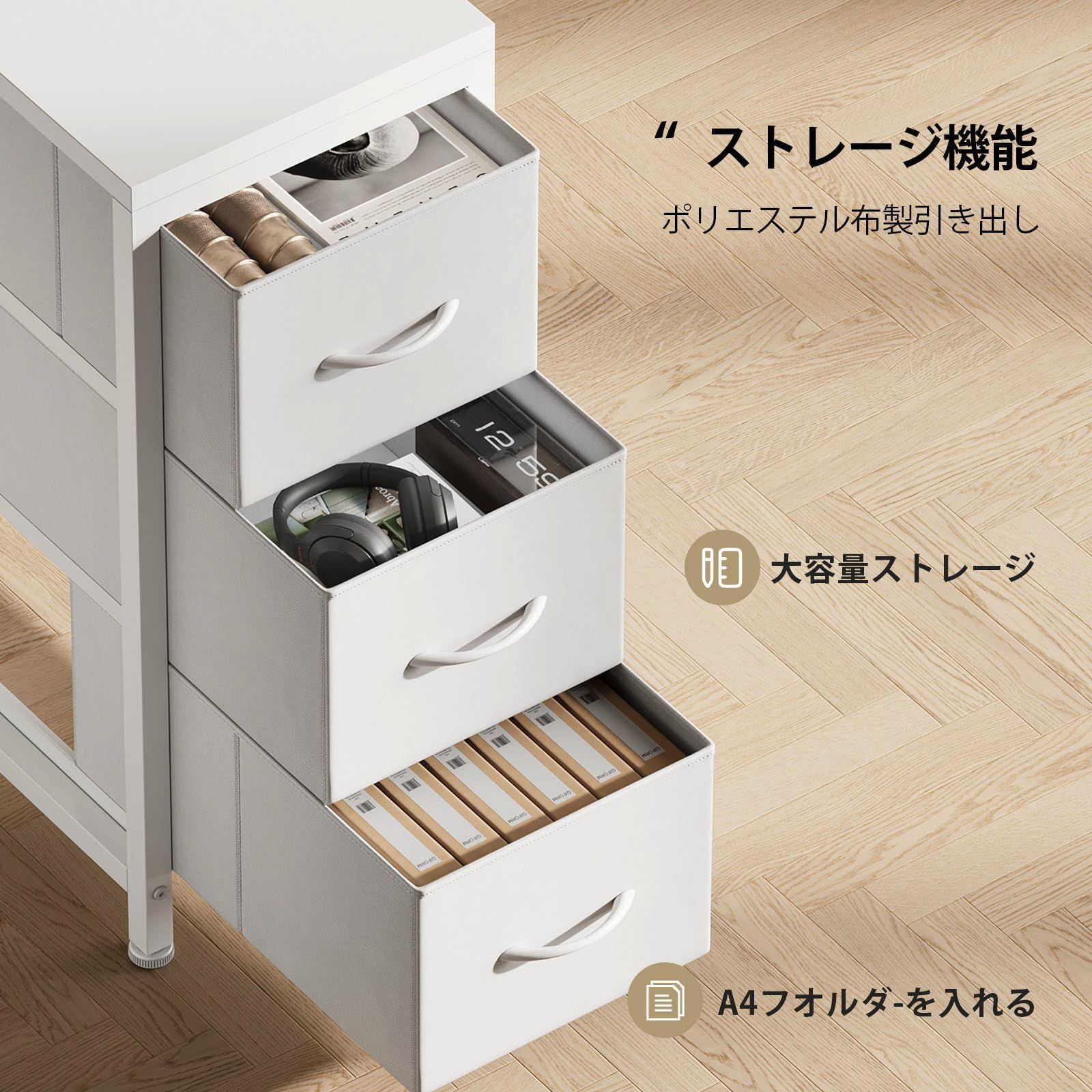 【最強の収納機能】大容量引き出し3つとA4ファイルも収まる大型棚板2枚、多功能モニタ台1枚を備え、デスク周りをまとめて収納。書類や文具はもちろん、PC本体やゲーム機なども整理でき、作業スペースを広々と保ちます。