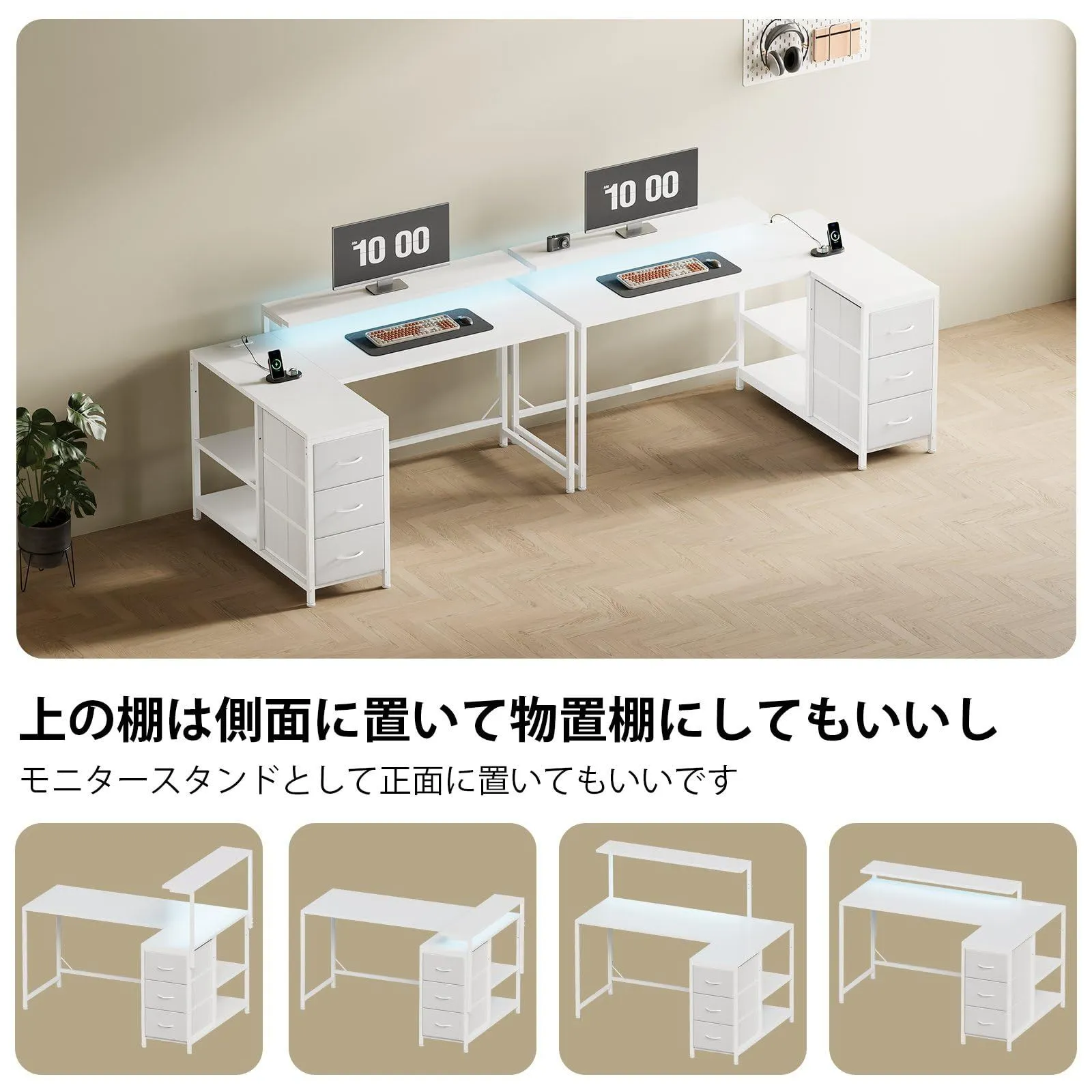 【多目的に活躍】天板は左右どちらにも設置可能。モニター棚は高さ2段調整かつ正面・側面の両方に取り付け可能で、視界やスペースに合わせた最適なレイアウトを実現。棚板も調節可能で、使い勝手の良さが魅力です。この机は在宅勤務、PC作業、ゲームプレイ、テレワークなどの様々なシーンにに活躍します。勉強机や作業台としても利用できます。