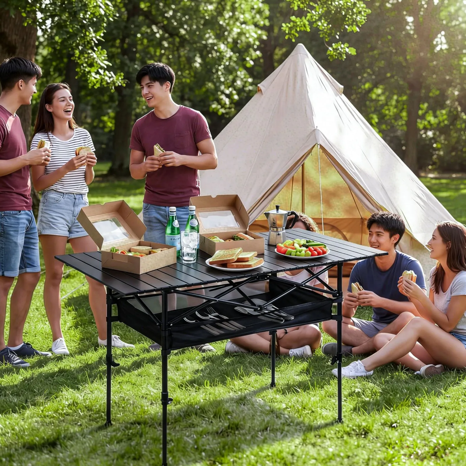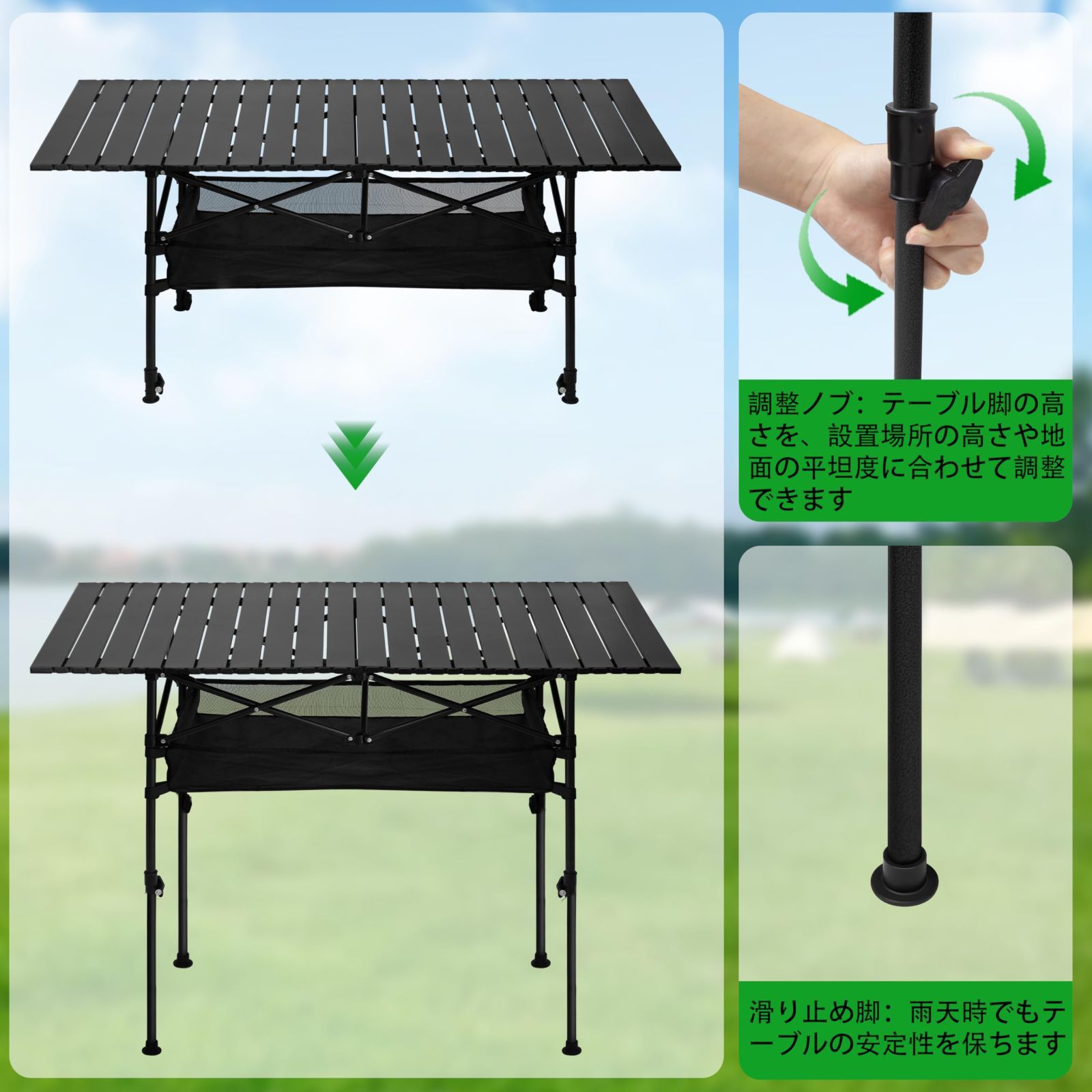 【広々天板で大人数対応 & 全天候使用可能】120×55cmの広々デスクサイズで、4?6人同時の食事や作業が可能です。収納用メッシュポケット付きで小物も整理でき、ピクニックやアウトドアワーク、テールゲートパーティーなど多彩なシーンで活躍。さらに、撥水・耐熱コーティング加工により水や汚れを簡単に拭き取れ、熱い鍋の直置きにも対応。あらゆる天候条件下で快適にご使用いただけます。