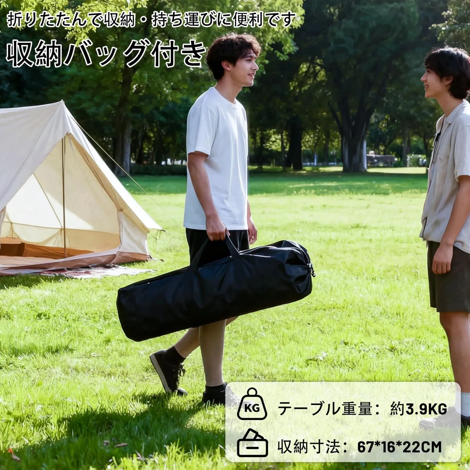 【軽量・コンパクトで持ち運び楽々】本体重量は約3.9kgと軽量。折り畳むとコンパクトになり、付属の収納バッグに入れば片手で運べます。車のトランクやバックパックにすっきり収納でき、キャンプやピクニックに最適です。使用時/約120×55×高さ(50-80cm)、収納時/約:67*16*22cm 。本体重量 : 3.9kg。