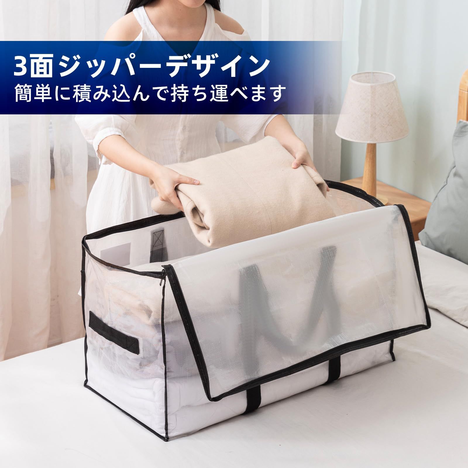 使いやすい:三面ジッパーを備えたバッグはバッグを完全に開くことができるため、すべてのアイテムを柔軟にバッグに入れるのに十分な幅があります。 使用しないときは、平らにして、再度必要になるまで保管してください。ハンドルデザインは青い包装袋を底から側面まで包み込み、底の耐荷重性を向上させます。前面の透明ウィンドウとラベルカードスロットにより、保管されているアイテムをすぐに識別できます