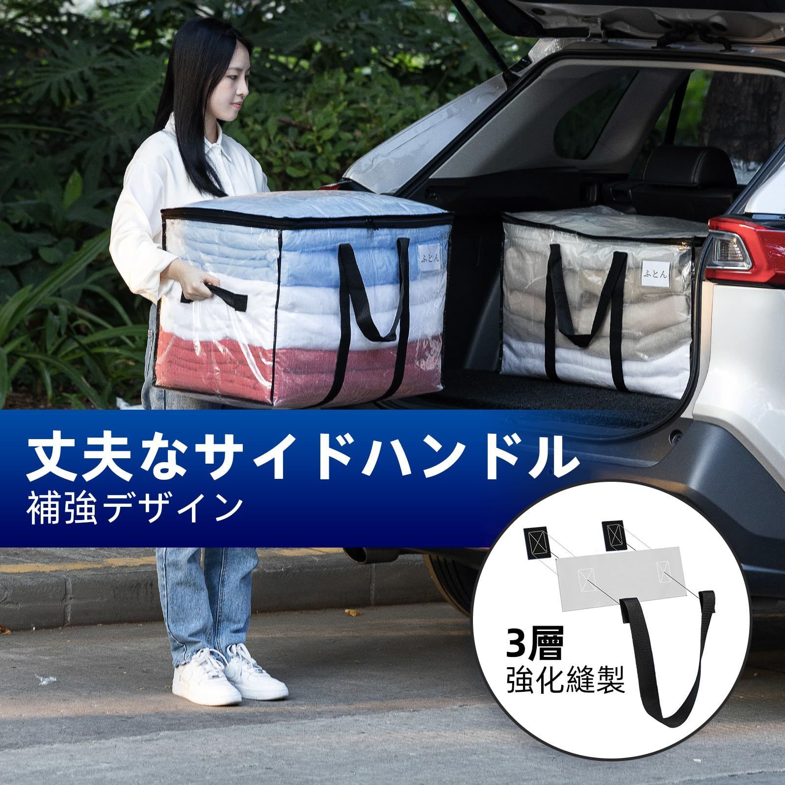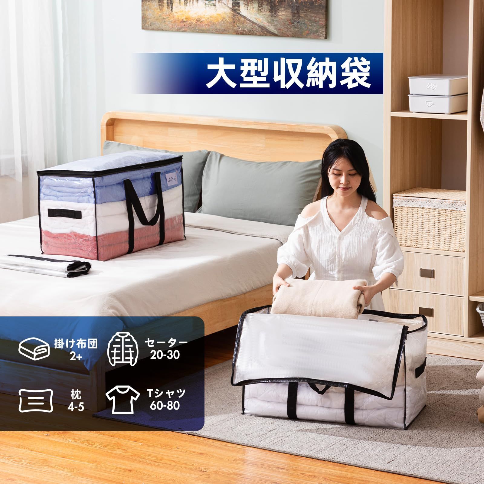 100L大容量、収納力抜群:抜群な特大引越しバッグの寸法:70 cm 35 cm 42 cm、4 パック。 両端のジッパーと中央に大きな開口部があるため、衣類、おもちゃ、靴、タオル、必需品、枕、寝具、シーツ、毛布、洗濯物、クリスマス飾りなどを簡単に収納できます