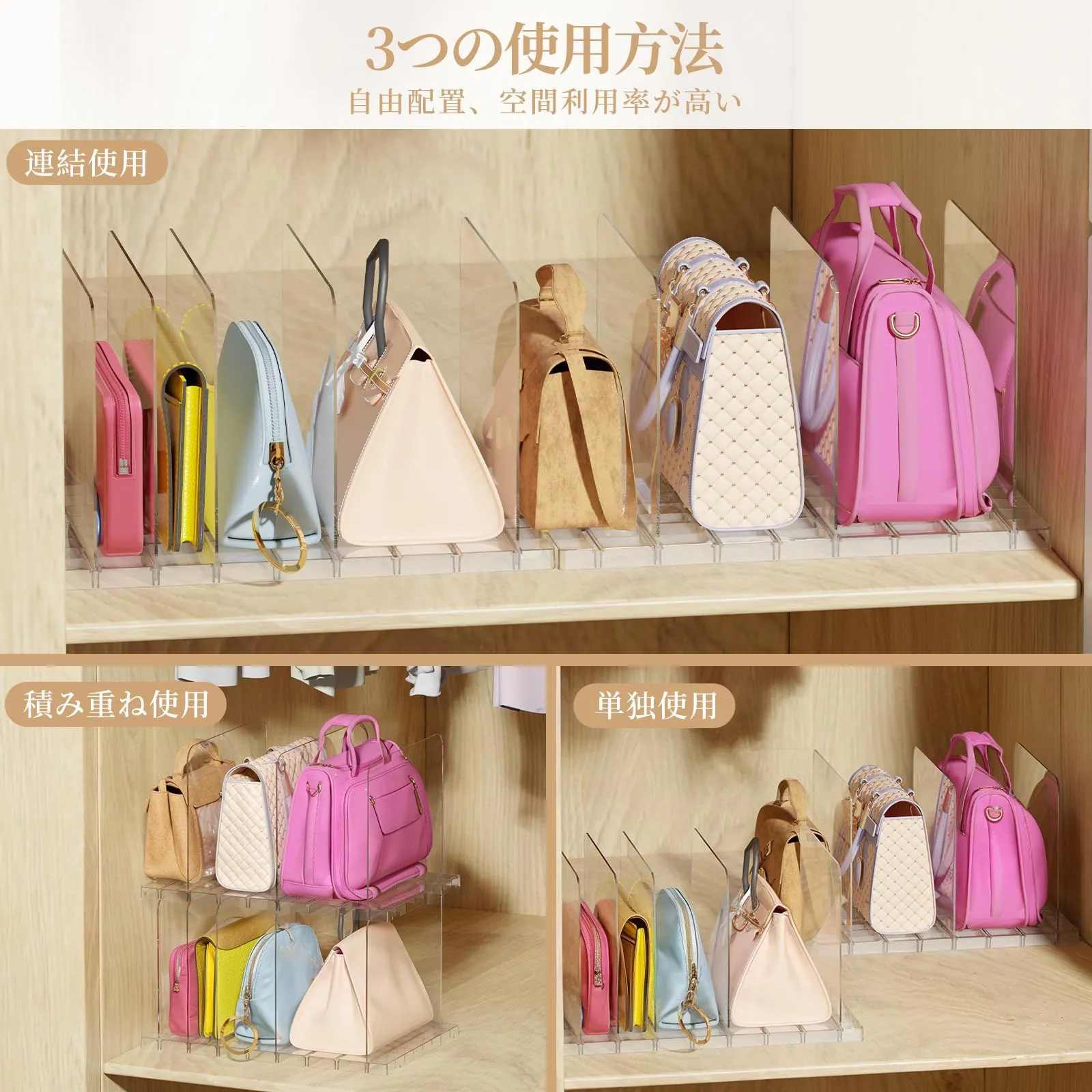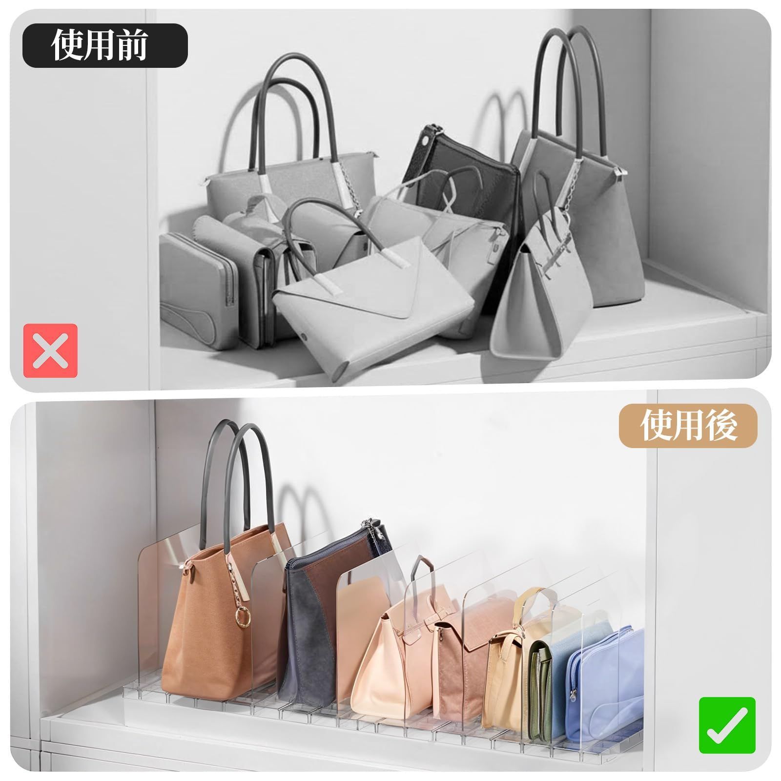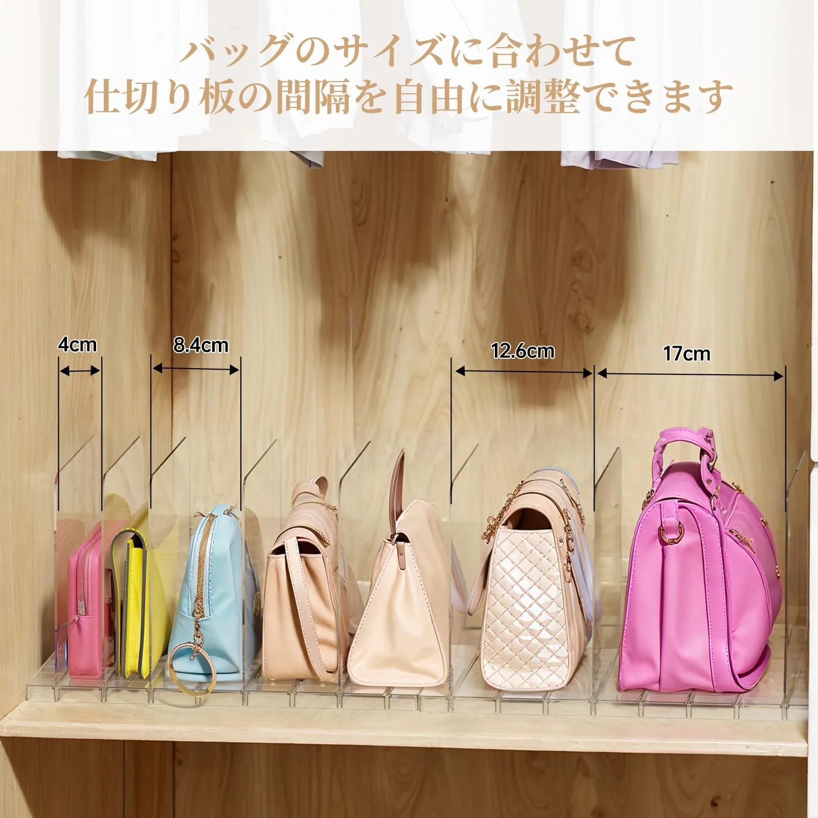 【間隔調節可能なバッグ収納】PAVSTINE カバン 収納は2個セットの仕切りスタンドで、1 つのスタンドに 4 枚の仕切り板が付属。バッグのサイズに合わせて仕切り板の間隔を自由に調整でき、様々なタイプのバッグに簡単に適応します。収納スペースがすっきり整理できます。