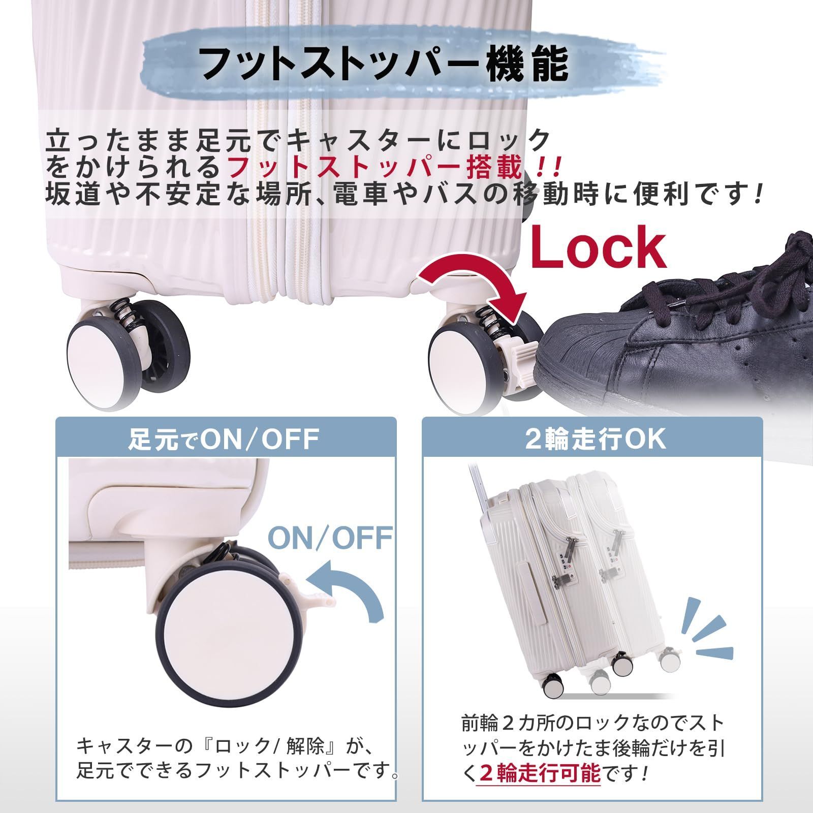 ?車輪ストッパー 簡単操作でスーツケースのキャスターをしっかりと固定。