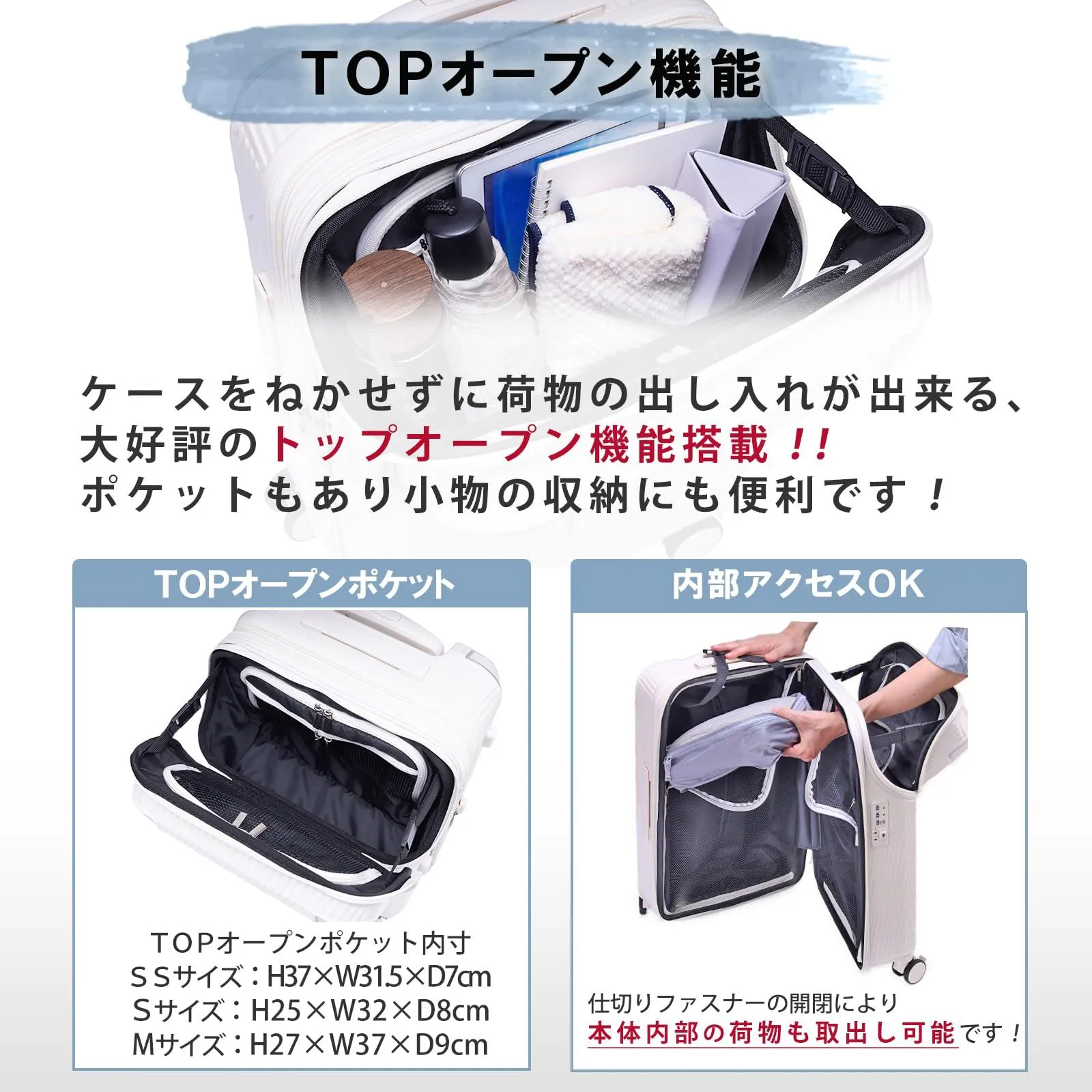 ?トップオープン機能 本体を開けずに上部のファスナーを開いて、荷物の出し入れが可能です。 中のファスナーの開閉により、本体内部の荷物も取り出し可能です。