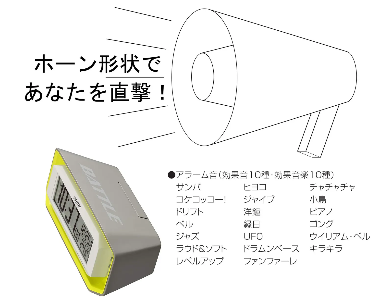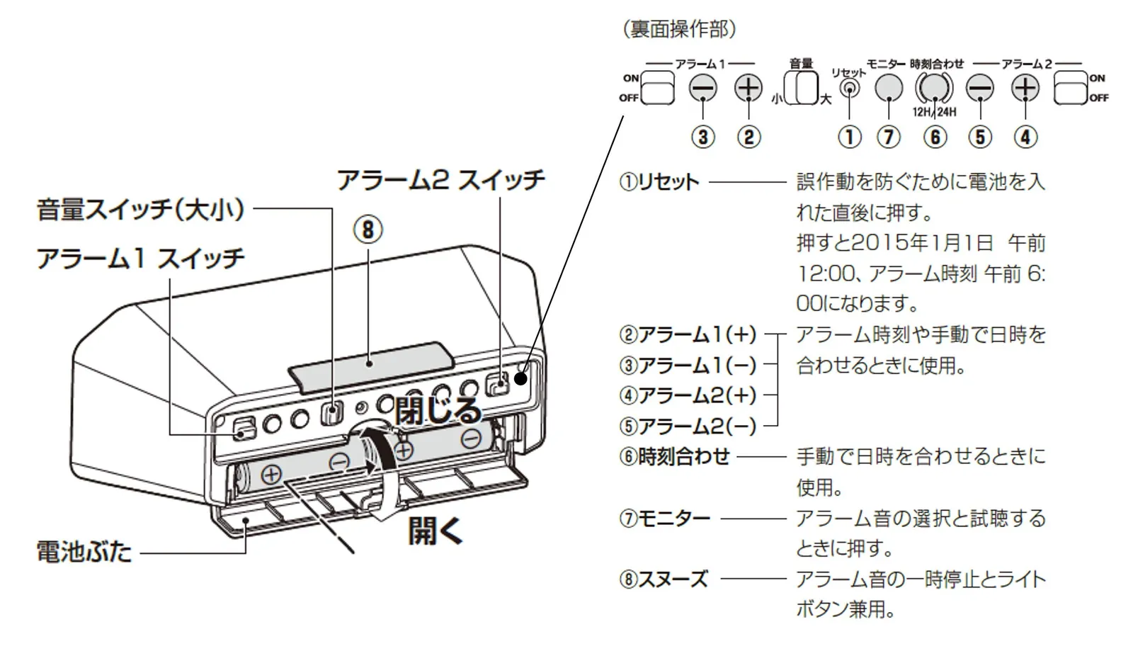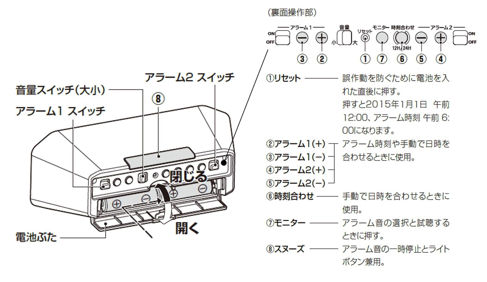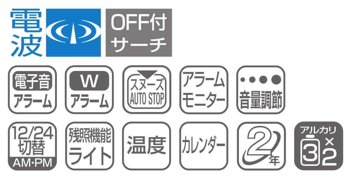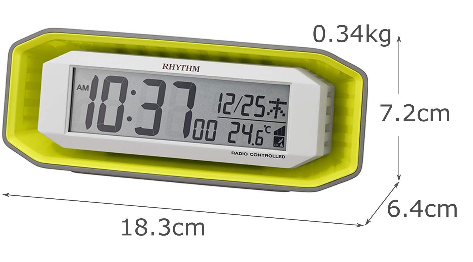 7.2×18.3×6.4cm使用電源:アルカリ単3形×2本(別売)ムーブメント:電波時計アラーム:大音量電子音(20種類の選択式)・(2つの時間をセットできるダブルアラーム機能)音量:大・小の切替式(止めても又鳴るスヌーズ付き)便利機能1:温度表示便利機能2:カレンダー便利機能3:残照機能ライト付き