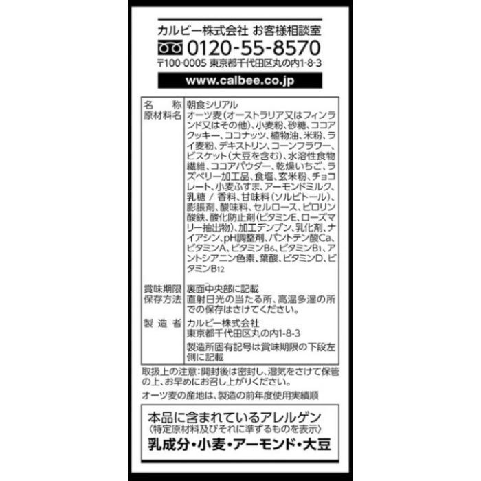原材料: オーツ麦(オーストラリア又はフィンランド又はその他)、小麦粉、砂糖、ココアクッキー、ココナッツ、デキストリン、植物油、ライ麦粉、米粉、コーンフラワー、ビスケット(大豆を含む)、水溶性食物繊維、ココアパウダー、乾燥いちご、ラズベリー加工品、食塩、玄米粉、小麦ふすま、アーモンドミルク、チョコレート、乳糖 / 香料、甘味料(ソルビトール)、膨脹剤、酸味料、セルロース、ピロリン酸鉄、酸化防止剤(ビタミンE、ローズマリー抽出物)、加工デンプン、乳化剤、ナイアシン、pH調整剤、パ ントテン酸Ca、ビタミンA、ビタミンB6、ビタミンB1、アントシアニン色素、葉酸、ビタミンD、ビタミンB12