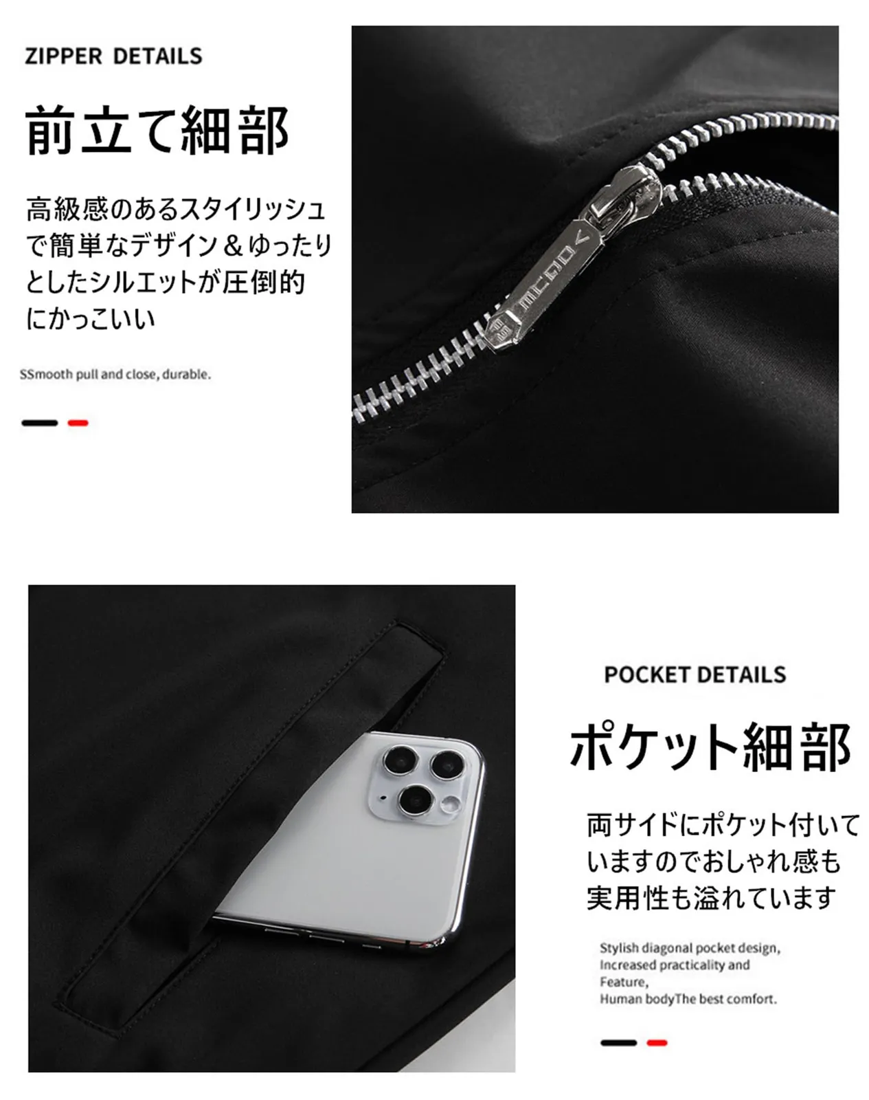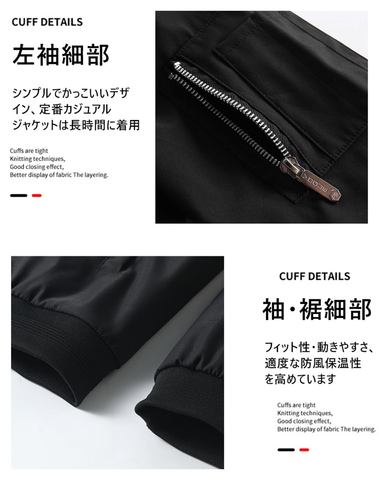 襟元・袖口・裾リブ仕様なので、適度な防風保温性を高めています。サイドポケット*2と左袖のジッパーポケット*1&ペン差し*2とインナーポケット*1の計4つのポケットが付いていて基本的な収納は十分。