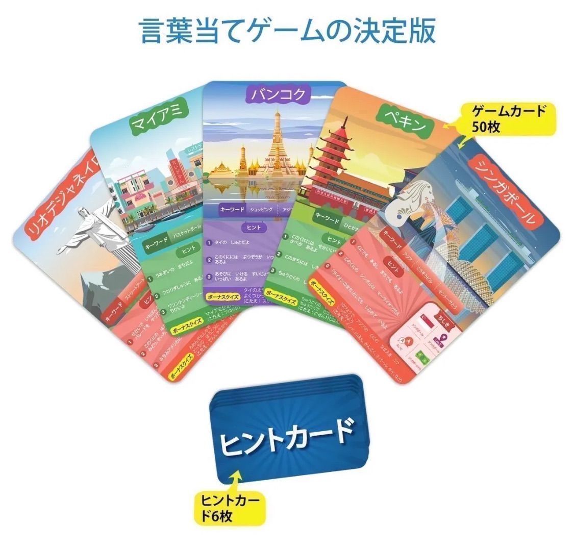 質問ゲーム: ゲーム カードに書かれた国に関する 10 個の質問に回答します。都市はアジアにありますか? 観光地ですか? 国の首都ですか? よく考えて賢く質問し、ヒント カードを賢く使用してください。最初に 7 枚のゲーム カードを集めた人が勝者になります。