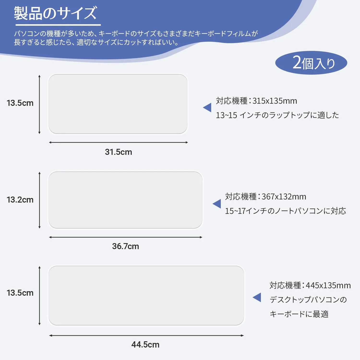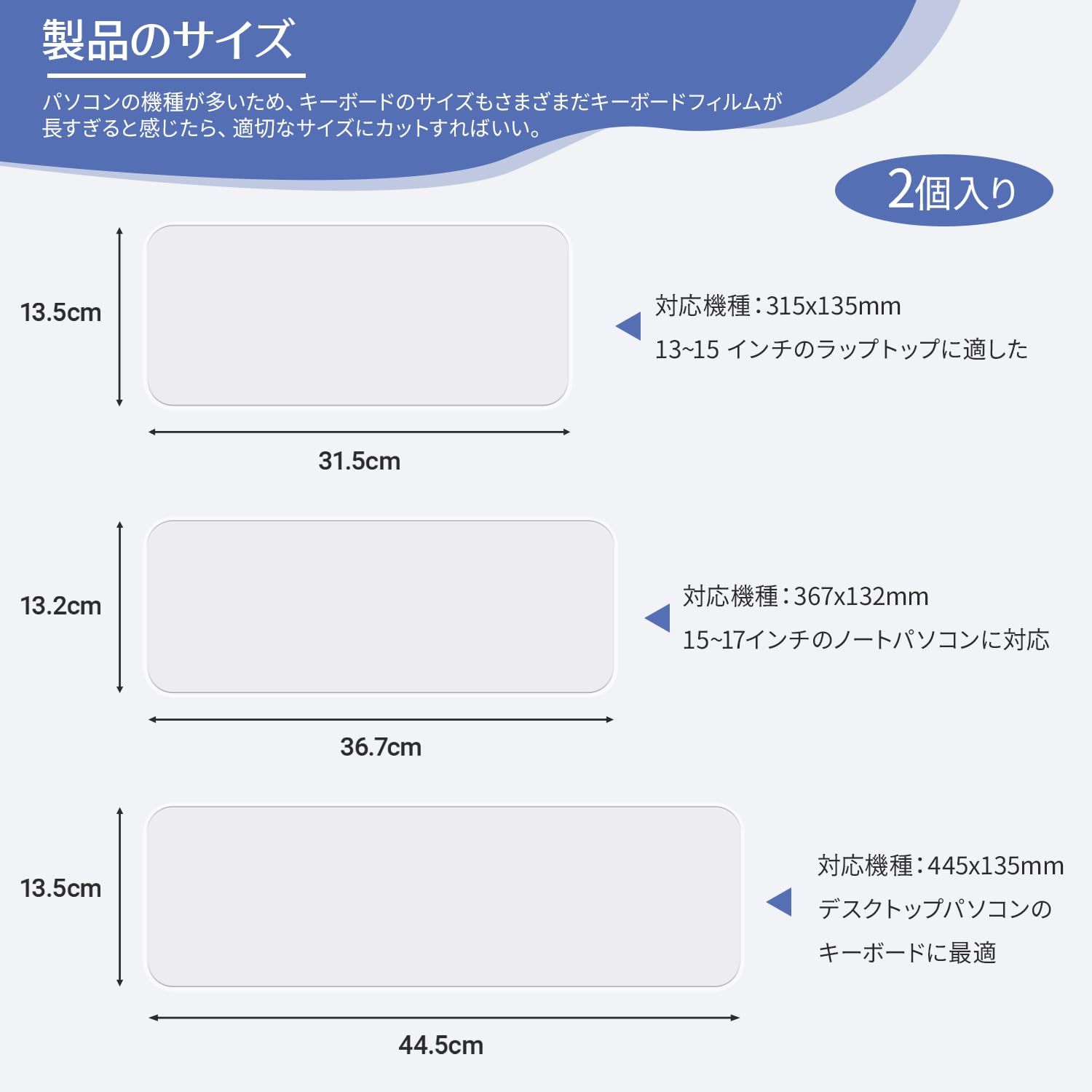 【2枚入り 3種類のサイズ展開】13?15インチ(31.5×13.5cm)、15?17インチ(35×12.9cm)、デスクトップ用(44.5×13.5cm) に対応したキーボードカバーです。