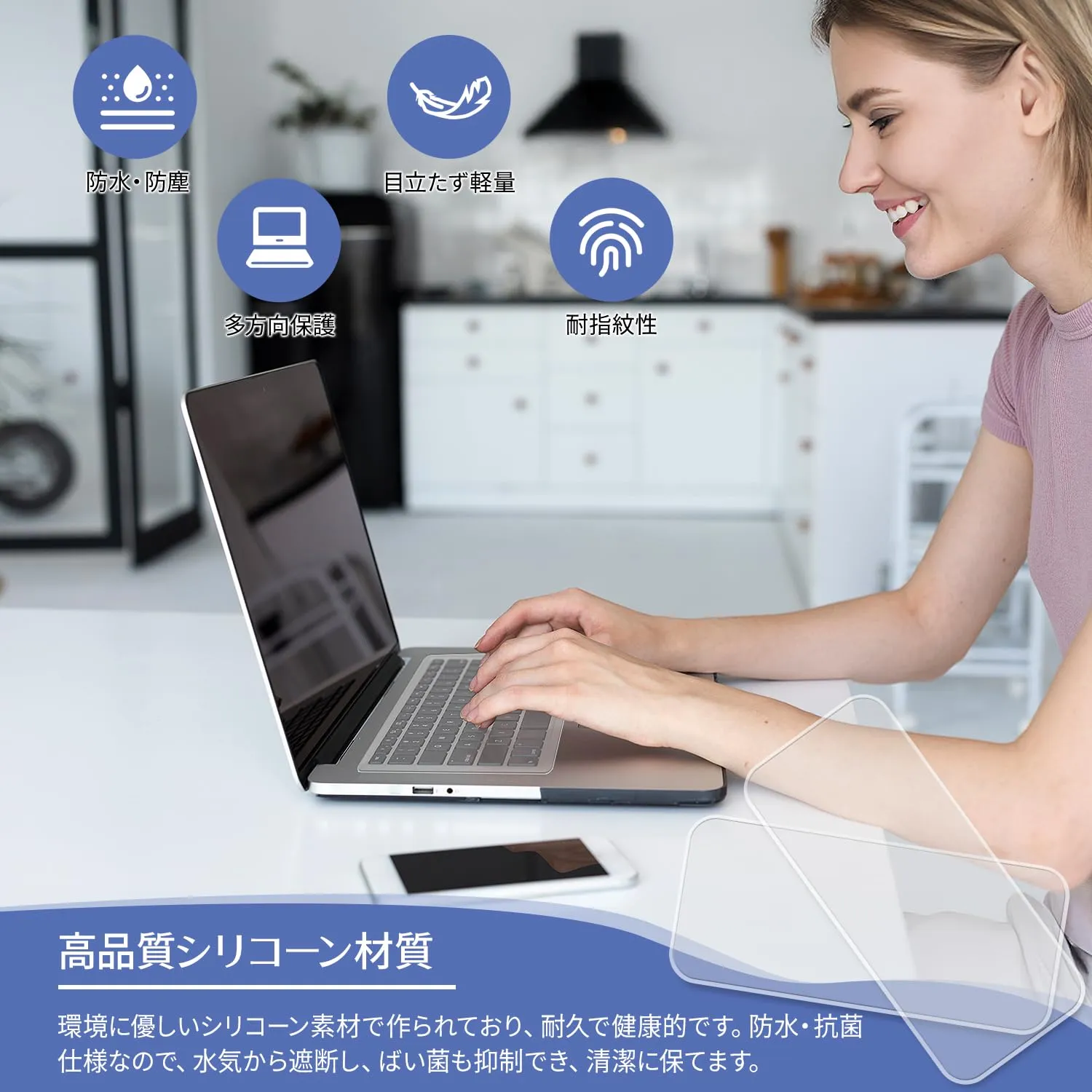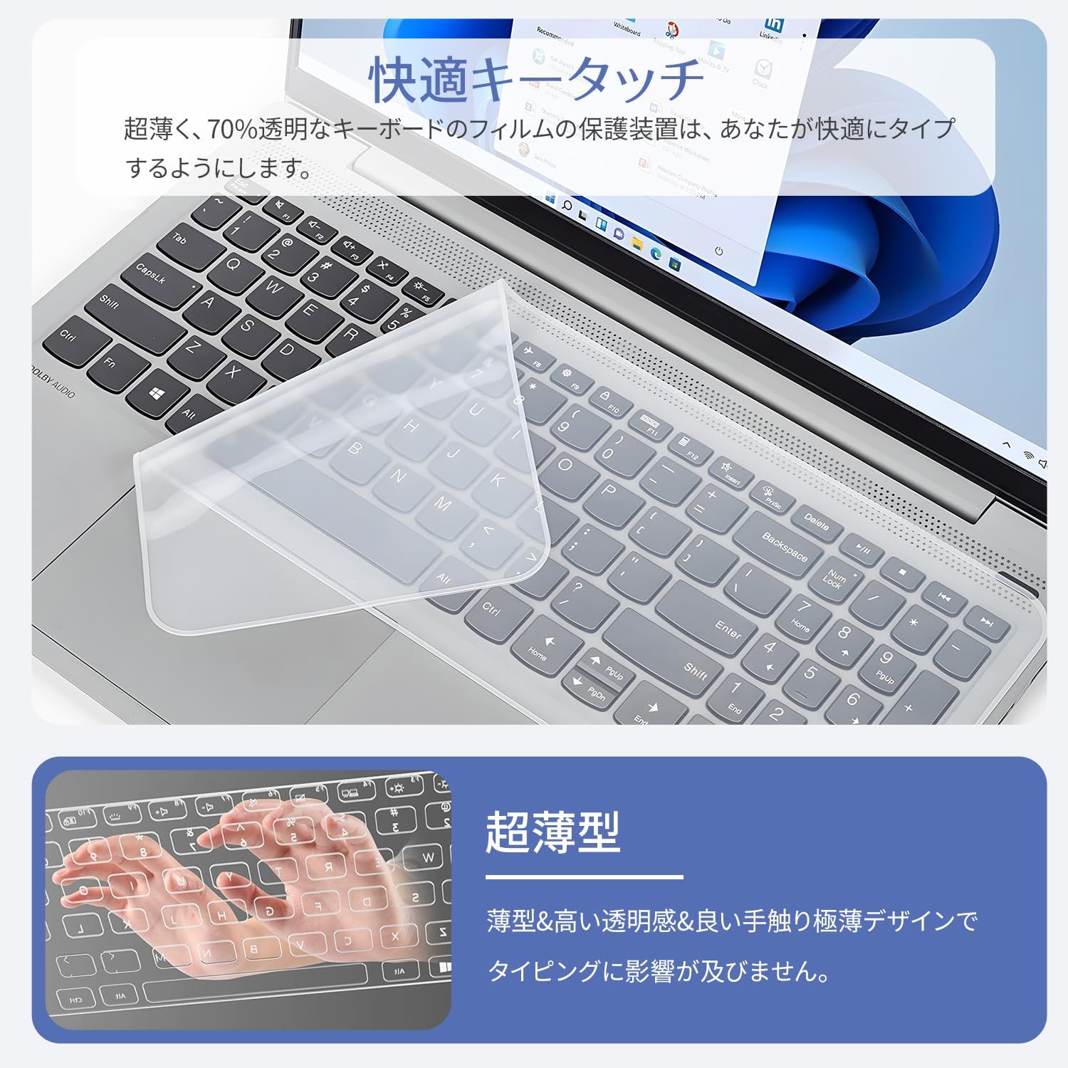 【0.3mmの極薄仕様】薄くて軽いため、タイピング感覚を損なわず、キーボードのデザインをそのまま活かせます。