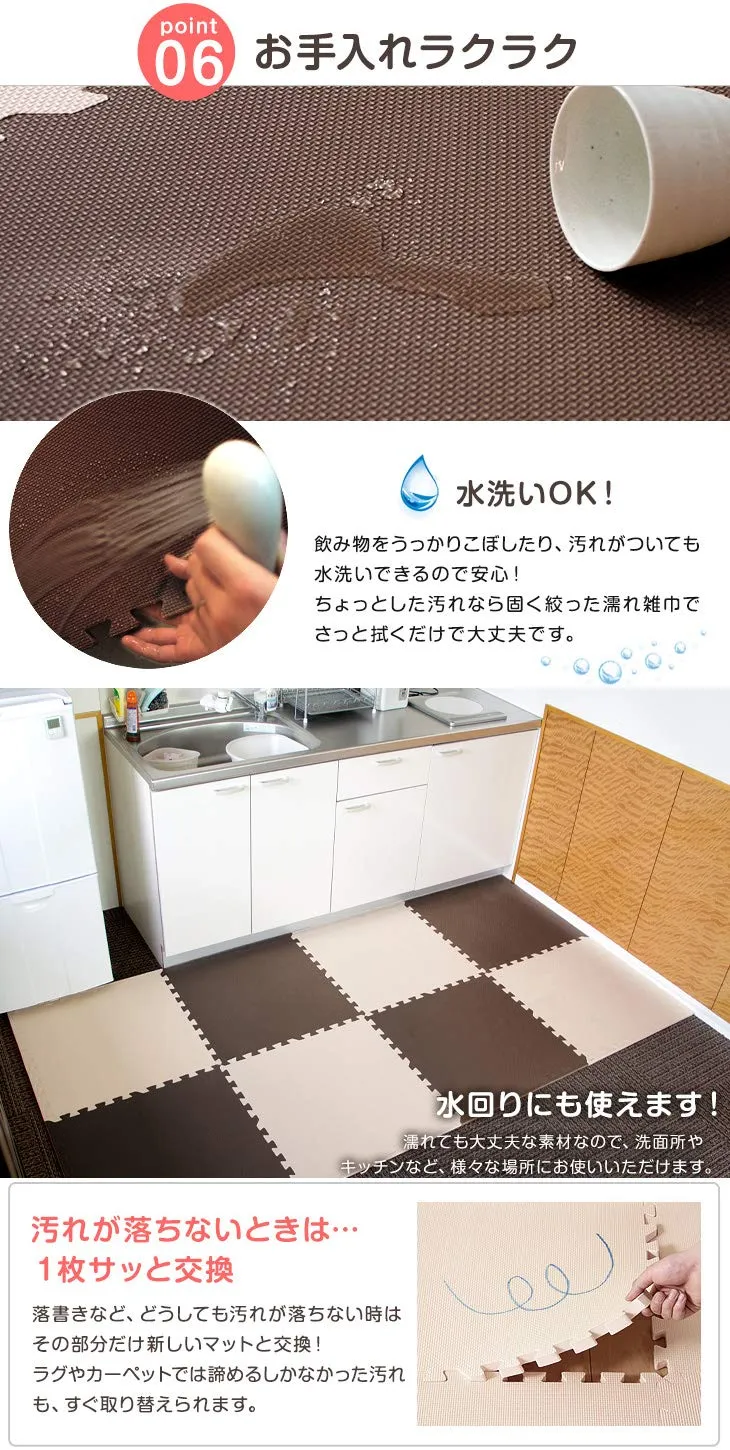 【お手入れ方法】・生産上マットをカットする際に生じた粉末が付着している場合がございます。 一度綺麗に水拭きしてからご使用ください。色落ちではありませんので、ご安心ください。 ・汚れた場合は固く絞った雑巾で拭き取るか、水洗いをしてください。 ・水分が隙間に入り込んだ場合はカビ発生の原因となる場合がありますので、定期的にマットを剥がして掃除してください。 ・匂いが気になる場合は、風通しの良いところで陰干してください。