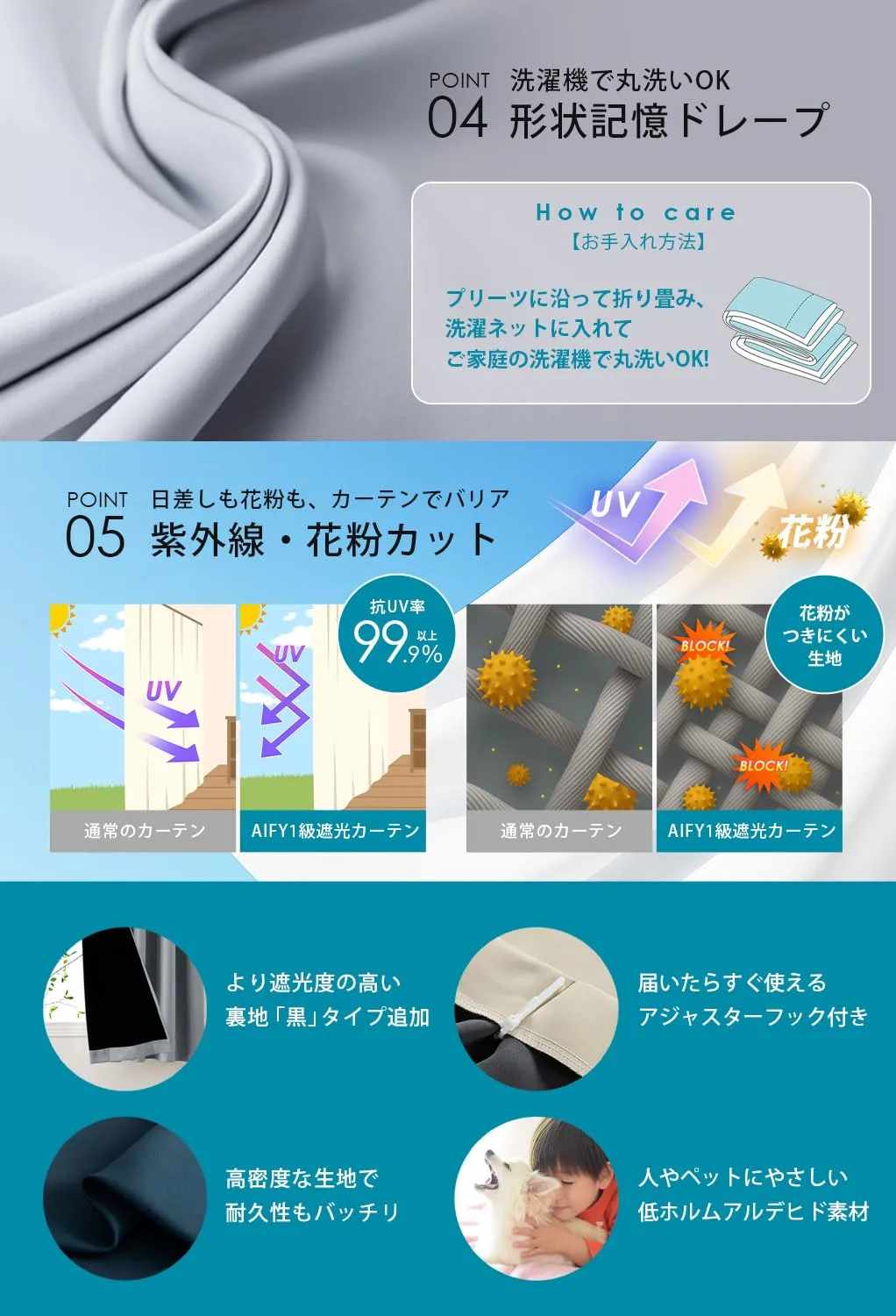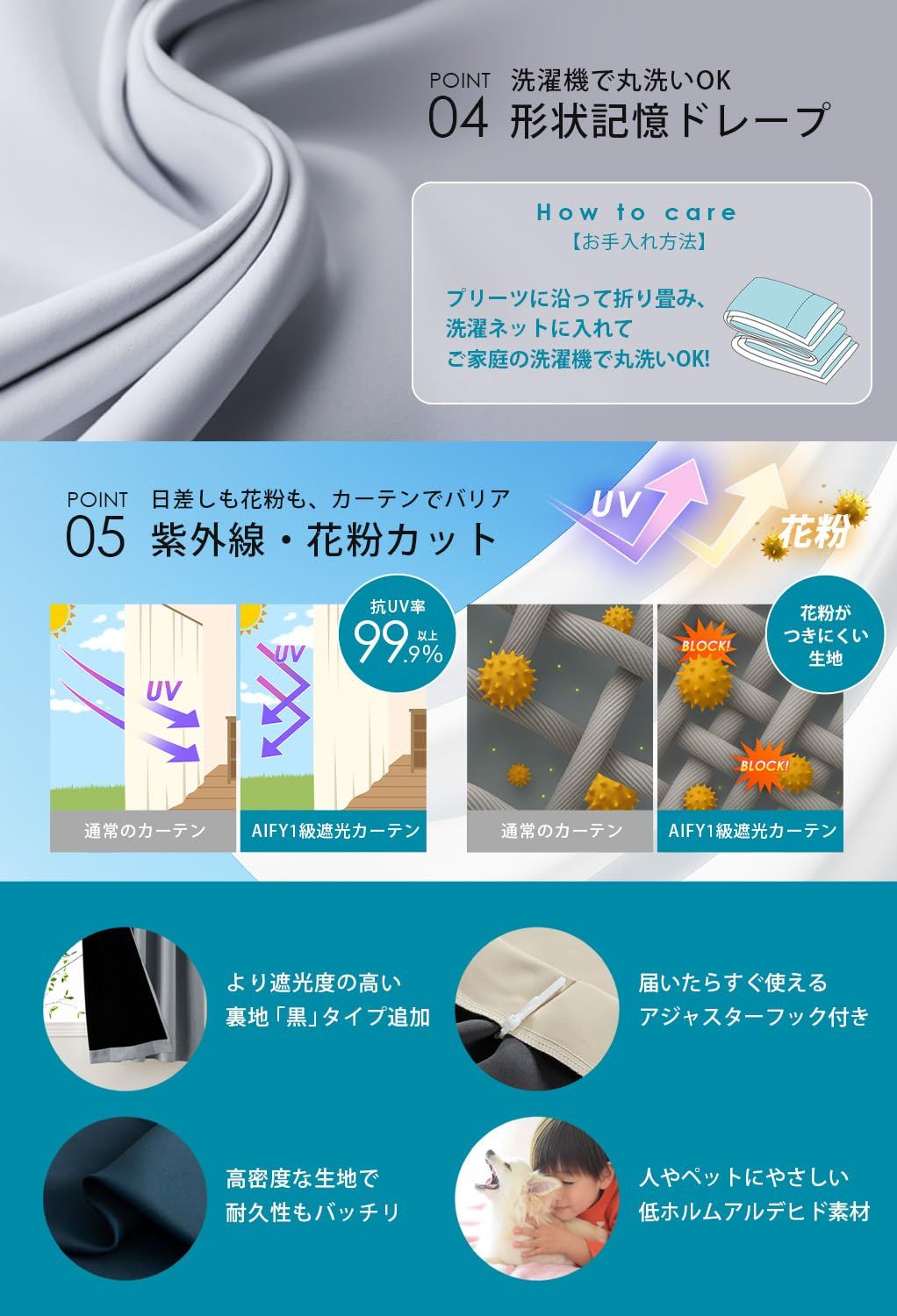 【ペットと人のためUVカット】このカーテンを使えば、紫外線をカットすることによってお肌も守るし、家具の日焼けや色褪せ防止にも働きます。また、犬の目は人間よりも紫外線に弱いと言われております。紫外線は犬の皮膚にもダメージを与えるので、浴び過ぎなら犬にとっても大敵です。そのため、UVカット効果で大切なペットを紫外線から守れます。