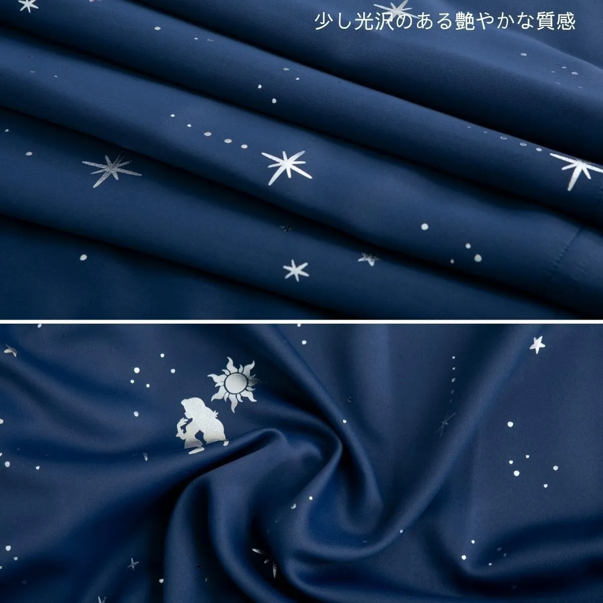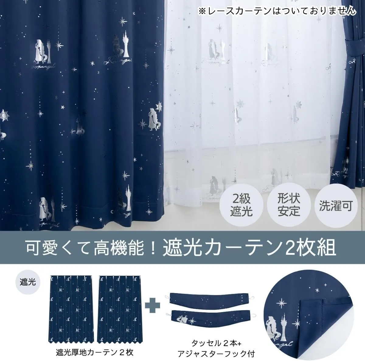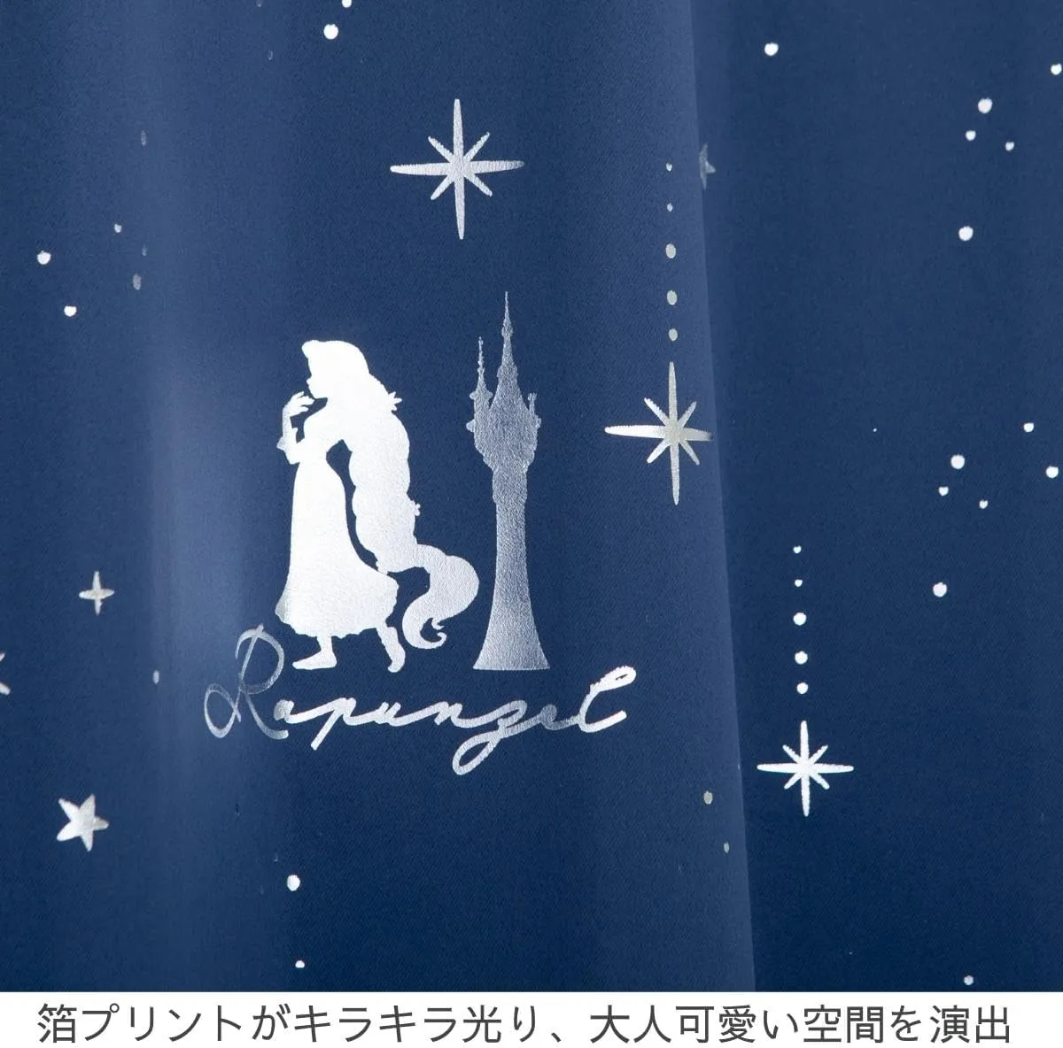 塔の上のラプンツェル(ディズニープリンセス 塔の上のラプンツェル)のドレープカーテン。2級遮光で外光をしっかり和らげ、夜間のプライバシーにも配慮。洗濯ネットに入れて丸洗いでき、日々のお手入れも簡単。既製3サイズにくわえ、幅100×丈80~170cmまで5cm刻みのセミオーダー18サイズを追加。合計21サイズから選べます。フックはAフック、タッセル付きで届いてすぐ使えます。