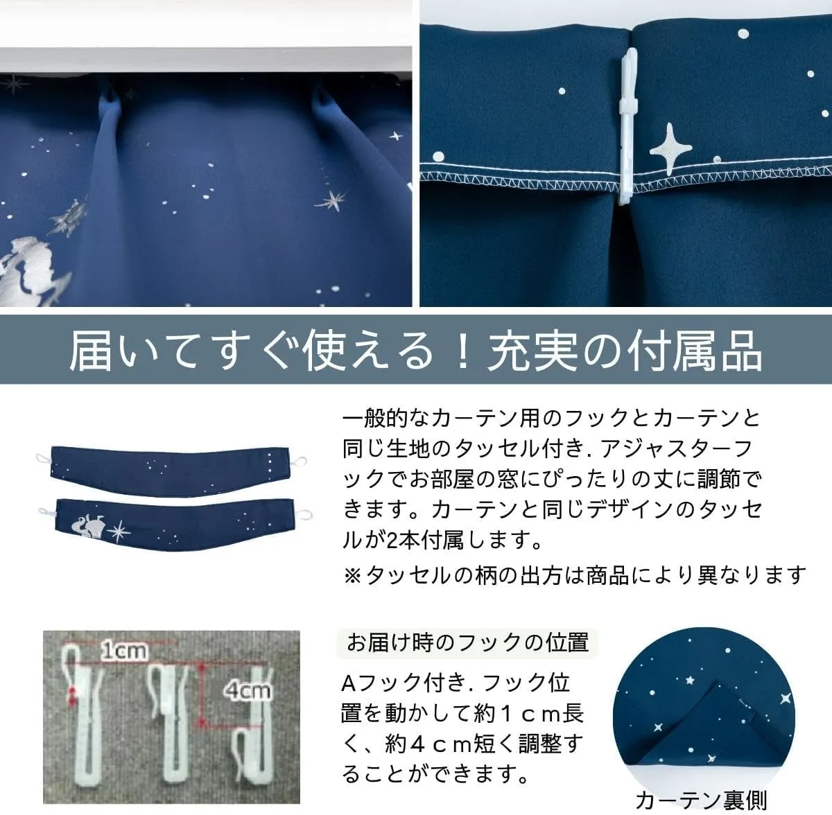 セット内容:カーテン2枚セット/同柄タッセル×2/アジャスターフック(Aフック)付属(高さ調整+1cm/?4cm)