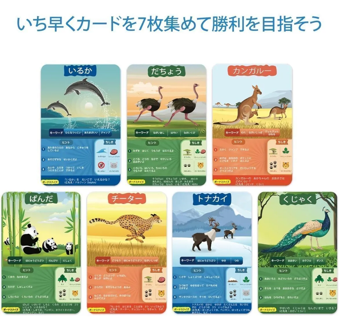 勝つための戦術を考えよう:ヒントカードやボーナスクイズを駆使して、一番先に7枚のゲームカードを集められるよう戦略を練りましょう。