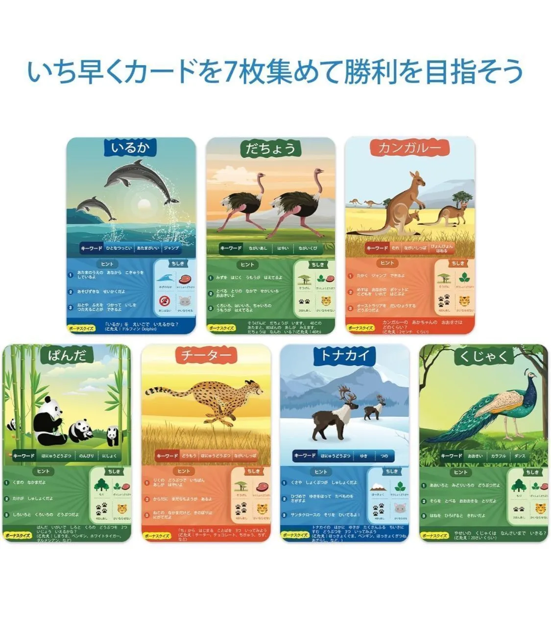 最初に7枚のゲームカードを集めた人が勝者になります!