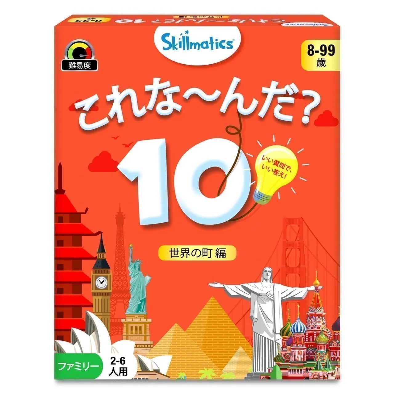 質問ゲーム: ゲーム カードに書かれた国に関する 10 個の質問に回答します。都市はアジアにありますか? 観光地ですか? 国の首都ですか? よく考えて賢く質問し、ヒント カードを賢く使用してください。最初に 7 枚のゲーム カードを集めた人が勝者になります。