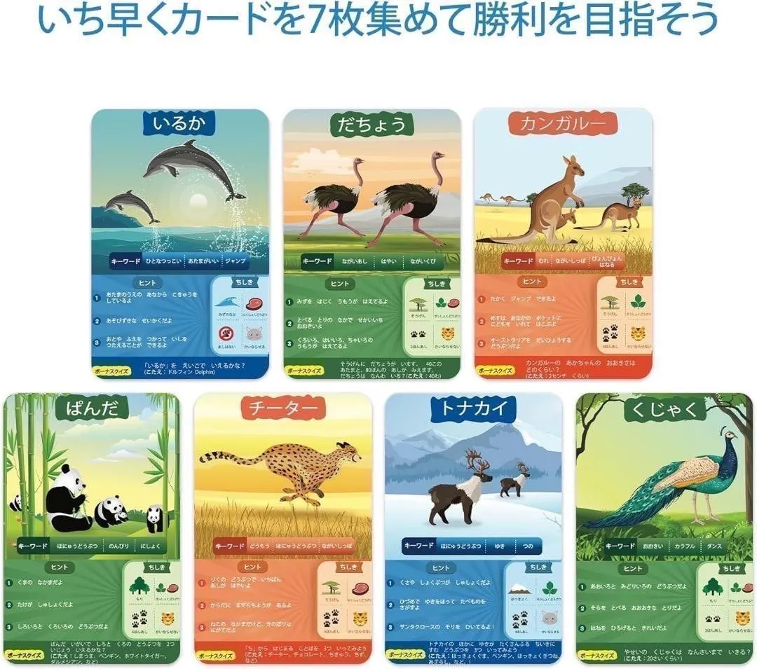 質問して頭が良くなるお手軽ゲーム:チームに分かれるか1対1でプレイして、ゲームカードに書かれた動物について、10個まで質問しましょう!その動物は肉食?飼いならせる?群れで暮らしている?よく考えて賢く質問しましょう。最初に7枚のゲームカードを集めた人が勝者になります!