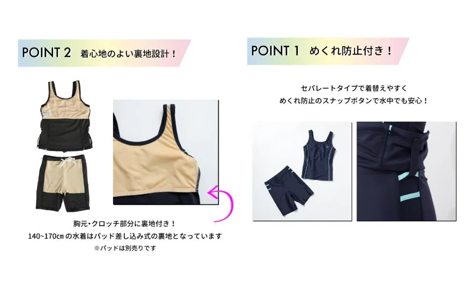 胸元・クロッチ部分に着心地の良い裏地付き。140-170cmの水着にはパッドが差し込めるポケット式になっています。(パッドは別売りです)