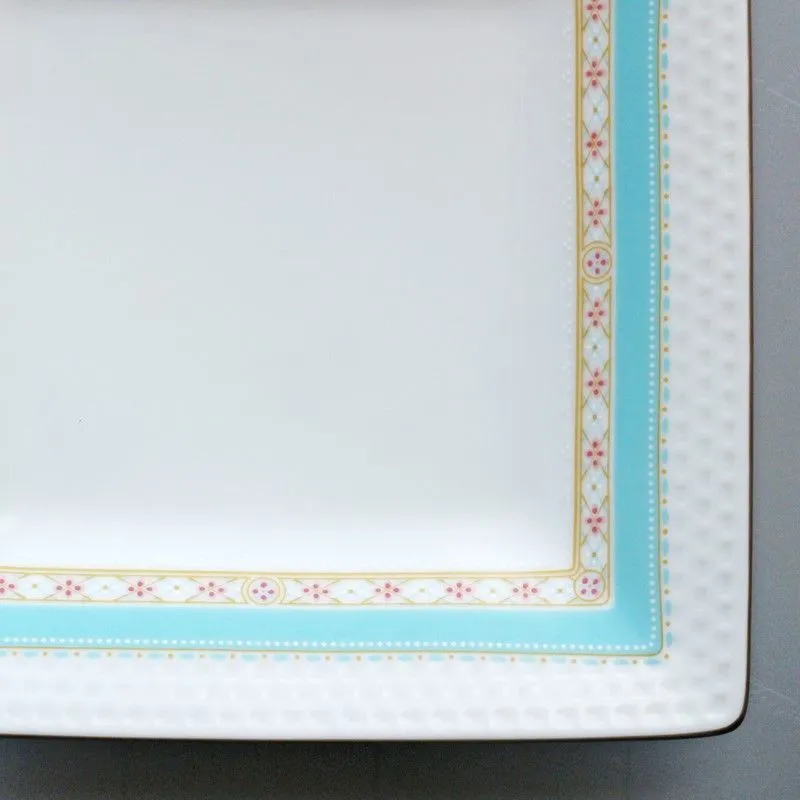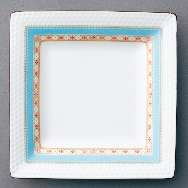●初期在庫:8 ターコイズブルーに繊細な白盛りと小花をまとう菱文様。 いつものティータイムをおしゃれに演出。 ケーキ皿などデザートにも、メインの食事にも使えるサイズです。 ※箱破れ・箱汚れによるアウトレット品なので中身は新品です。 食洗機には使えません。