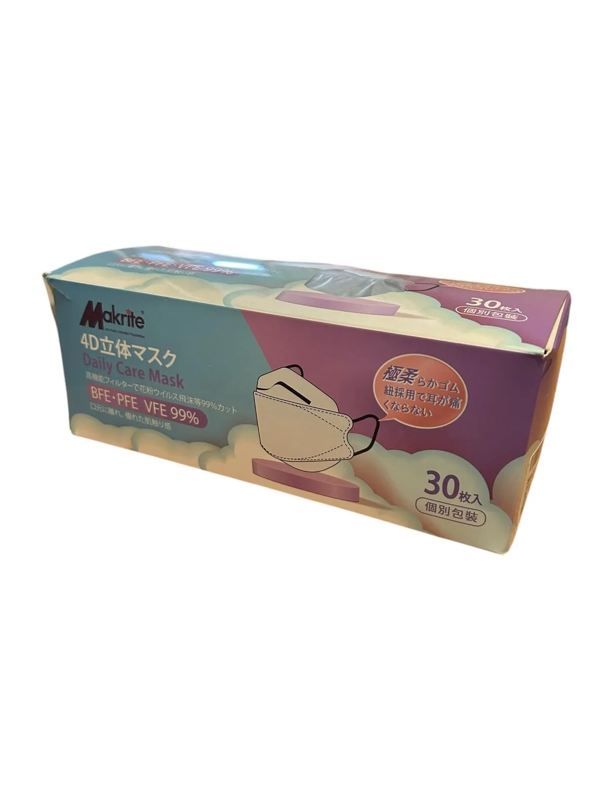 【4D立体構造】形が崩れにくい4D立体構造で口元の空間をキープ。口紅やメ イクが付きにくいほか、呼吸もしやすい形状となっています。