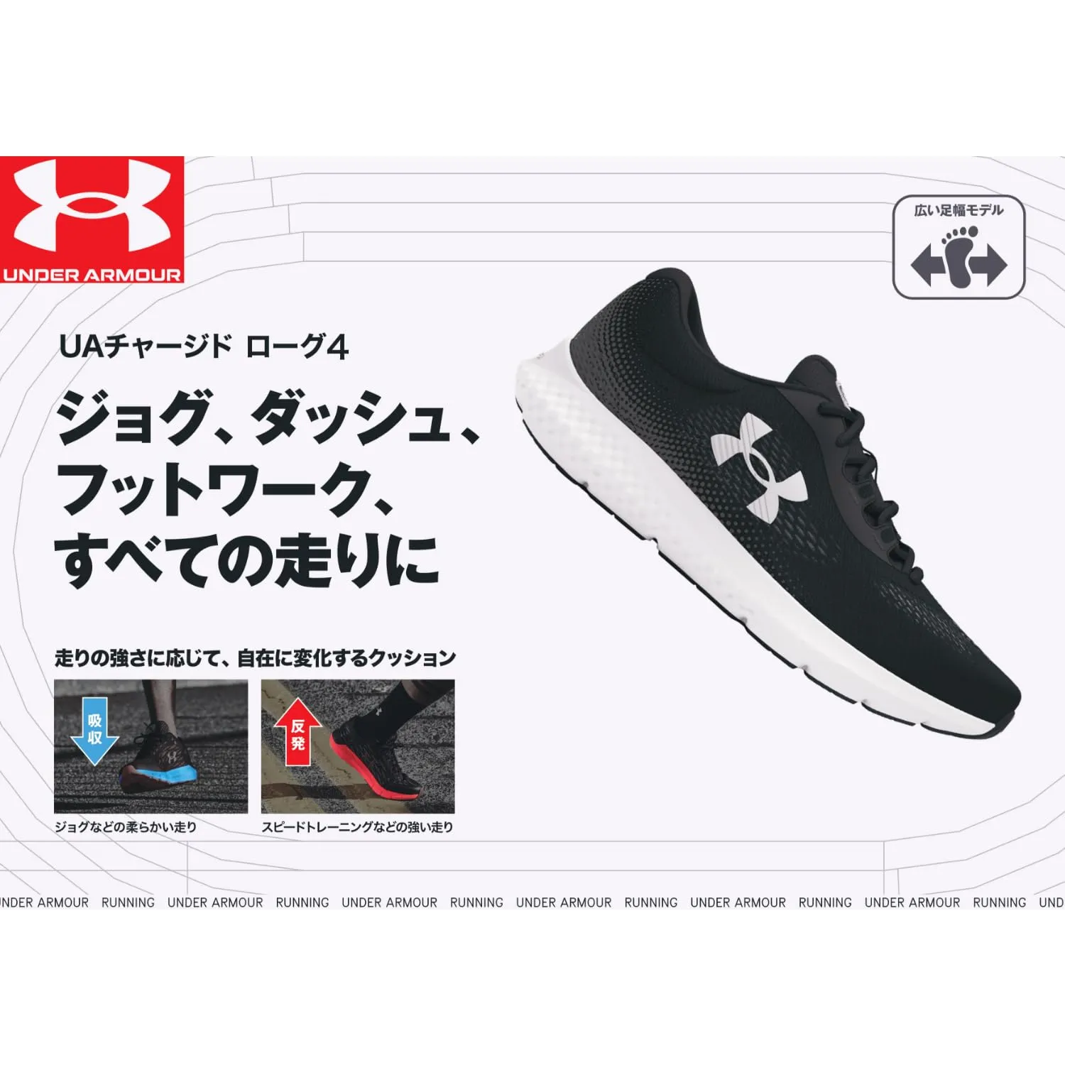 甲材:合成繊維/底材:合成樹脂、合成ゴム軽量で通気性に優れたメッシュとチャージドクッショニングのミッドソールを組み合わせて、優れた反発性と最高の衝撃吸収性を実現。デラックスフォームソックライナーが、足の形にフィットしてスリップを防ぎ、高いクッション性で足裏を快適にキープデュアルデンシティCHARGED(チャージド):加える力の大きさに応じて、柔らかいクッション性から鋭い反発性まで弾力性が変化するクッションフォームをブレンドソリッドラバーアウトソールが強い衝撃を受ける部分をカバーし、軽量でありながら優れた耐久性を実現ベトナムD相当