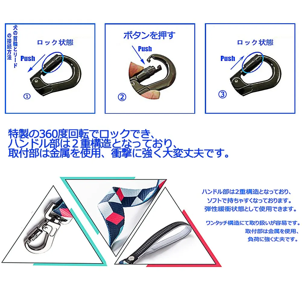 【独創性】ハンドル部は2重構造となっており、ソフトで持ちやすくなっております。トラクションロープにはナイロンゴム製の緩衝ベルトが付いており、犬が突然走り出しても衝撃を緩和します。
