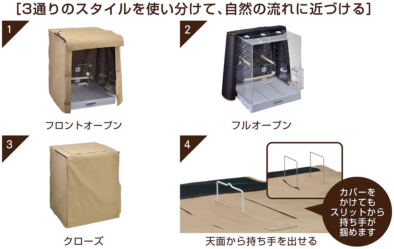 【取り付け方】 1、正面の面ファスナーをはがし、前後を確認して本製品を広げます。 2、ファスナーが前面にくるようにして、ケージの上からかぶせます。 3、正面の面ファスナーを留めます。 ・フルオープンにする時ケージに取り付け、左右のファスナーを開けることでケージの天面を開けることができます。 ・天面を開ける際は、ファスナーを開けた左右の布を三つ折りにし、側面にあるボタンで留めてください。