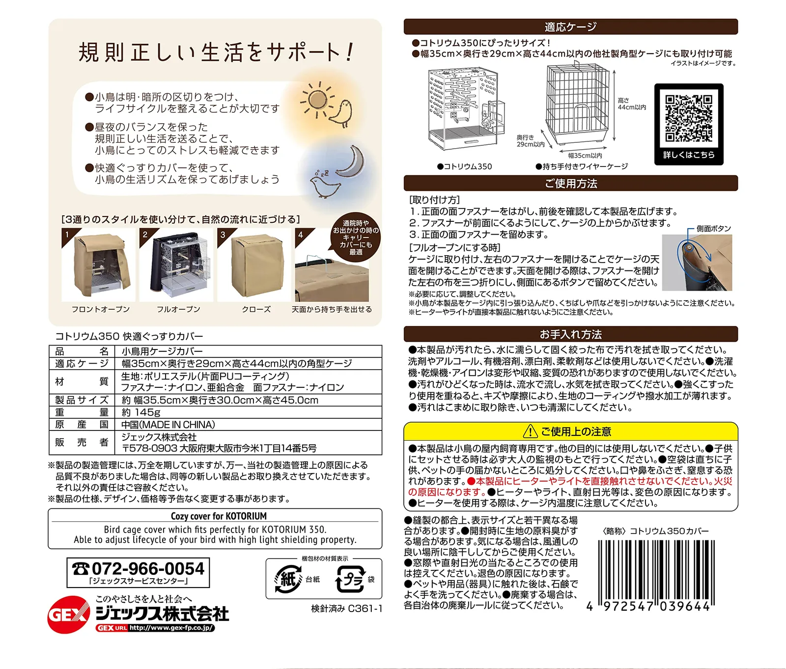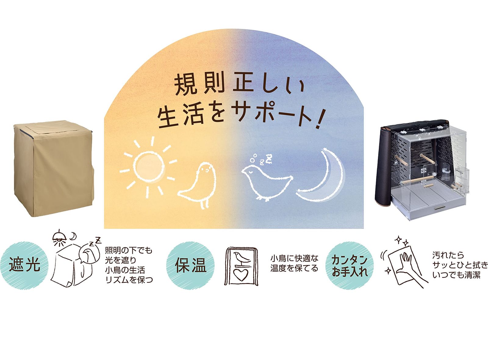 遮光照明の下でも光を遮り小鳥の生活リズムを保つ。保温小鳥に快適な温度を保てる