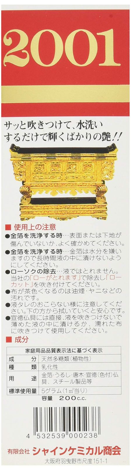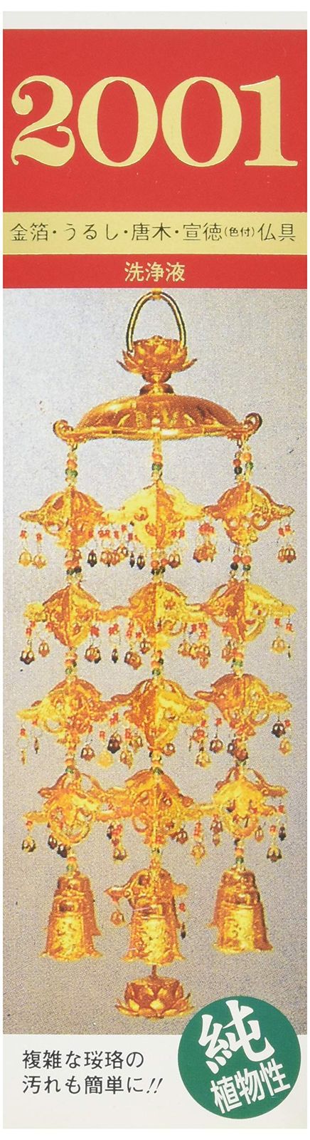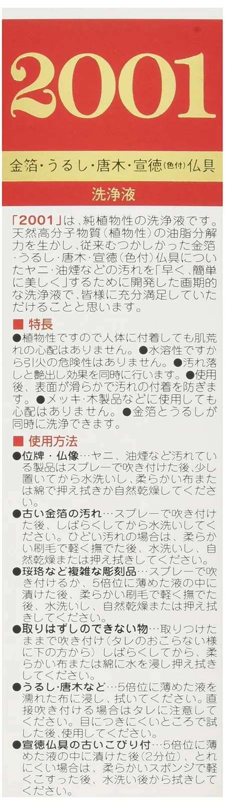 2001は純植物性の洗浄液です。天然高分子物質の油脂分解能力を生かし、従来難しかった金箔・うるしなどに付いたヤニ・油煙などの汚れを 早く簡単に美しくするために開発した画期的な洗浄液です。汚れ落としと艶出しを同時に行います。